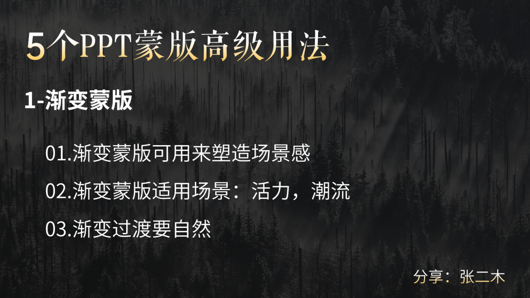 这次分享,总结了我在关于「PPT蒙版」上的5个高级设计手法,这是5个非常有用的设计套路,掌握这些套路,将会帮助你塑造更高级的PPT,也就是常说的,PPT中的精致感。