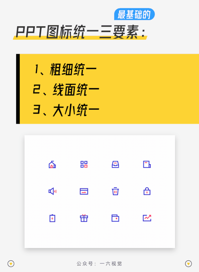 相信经过上面这些分享,你也应该能知道图标风格统一的重要性了,在PPT上,我们最基本需要保证的图标一致性是下面这3个: