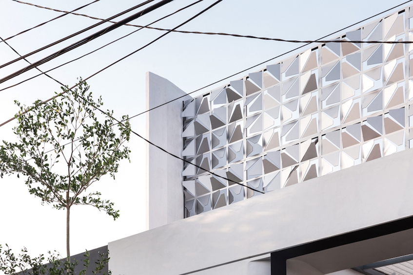 当阳光洒下,有如听见粼粼流水,静止的建筑也好似舞动著,这是印尼办公室设计所经手的翻新案例,黑白简约外观利用 ACP材质拼接穿透感围栅,以多角度的几何配置,筛落直射二楼的日光,于是立面也随著光影而生动。