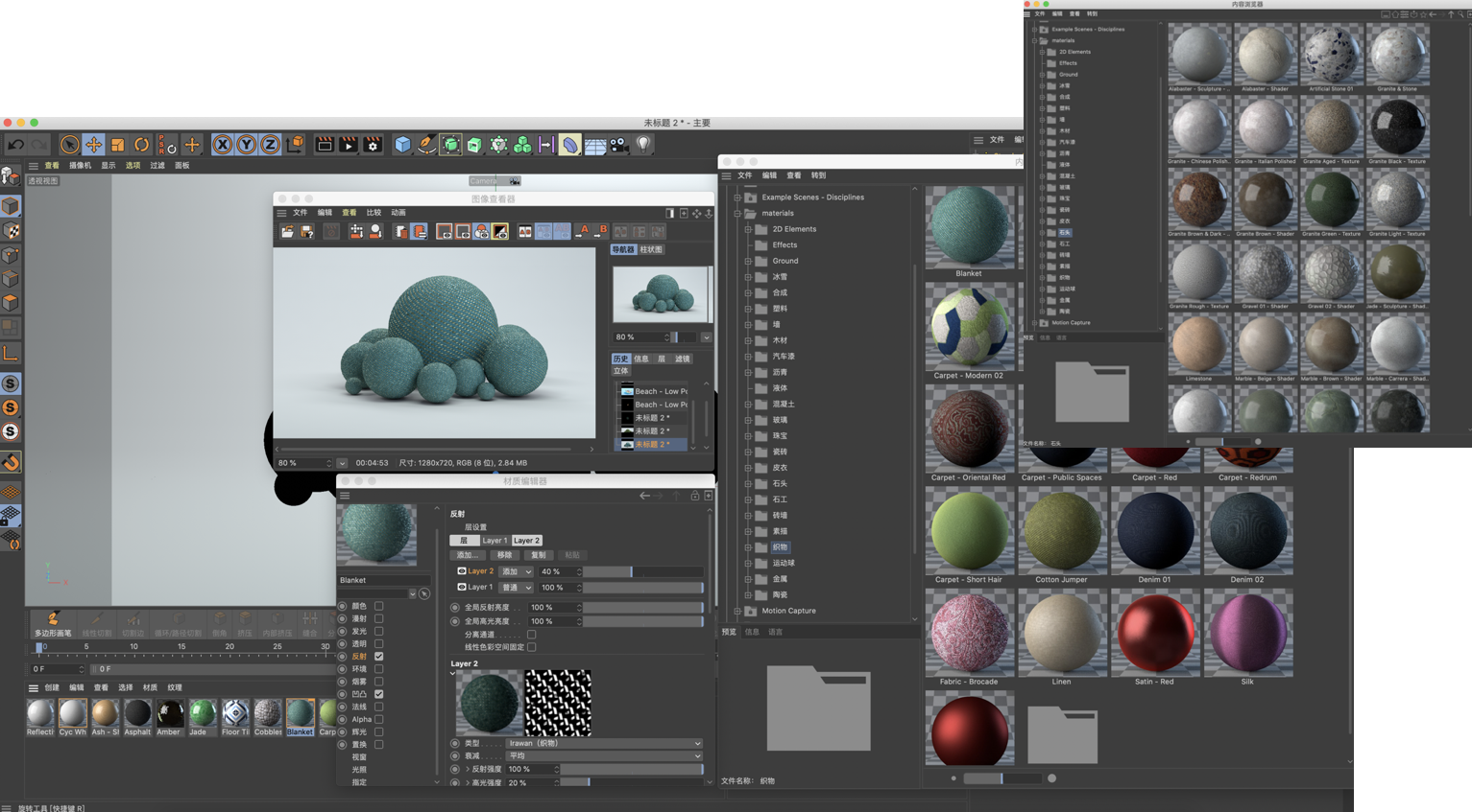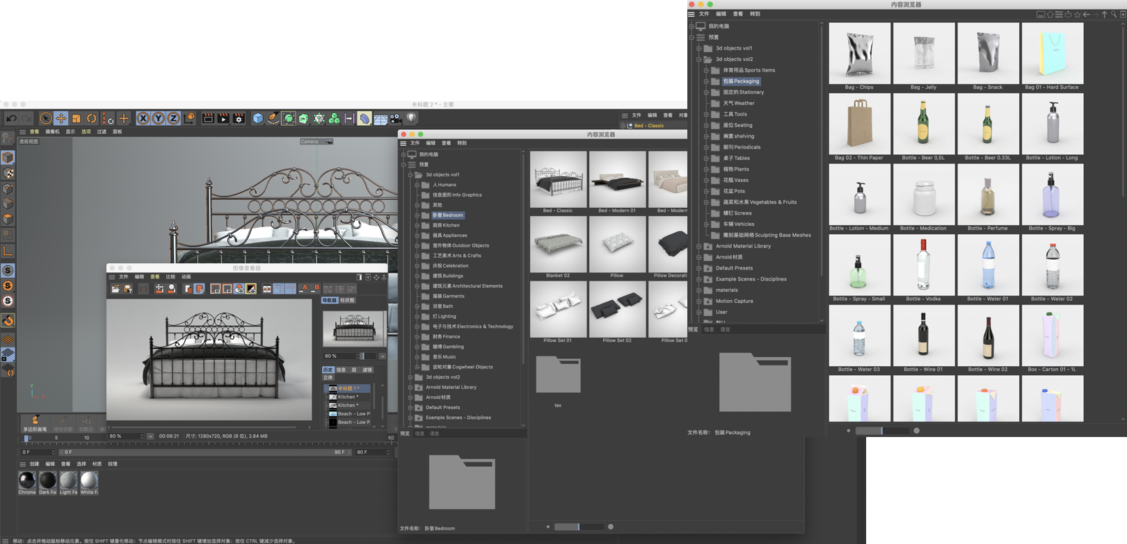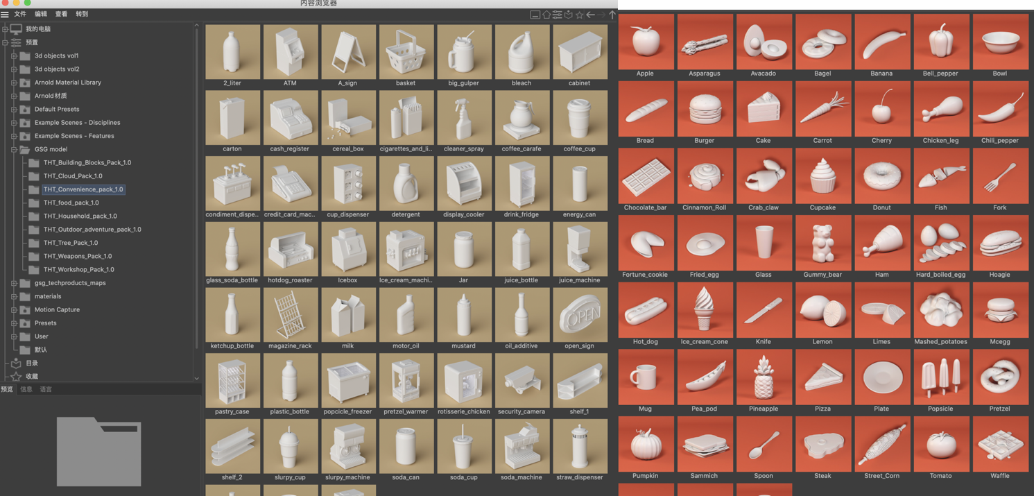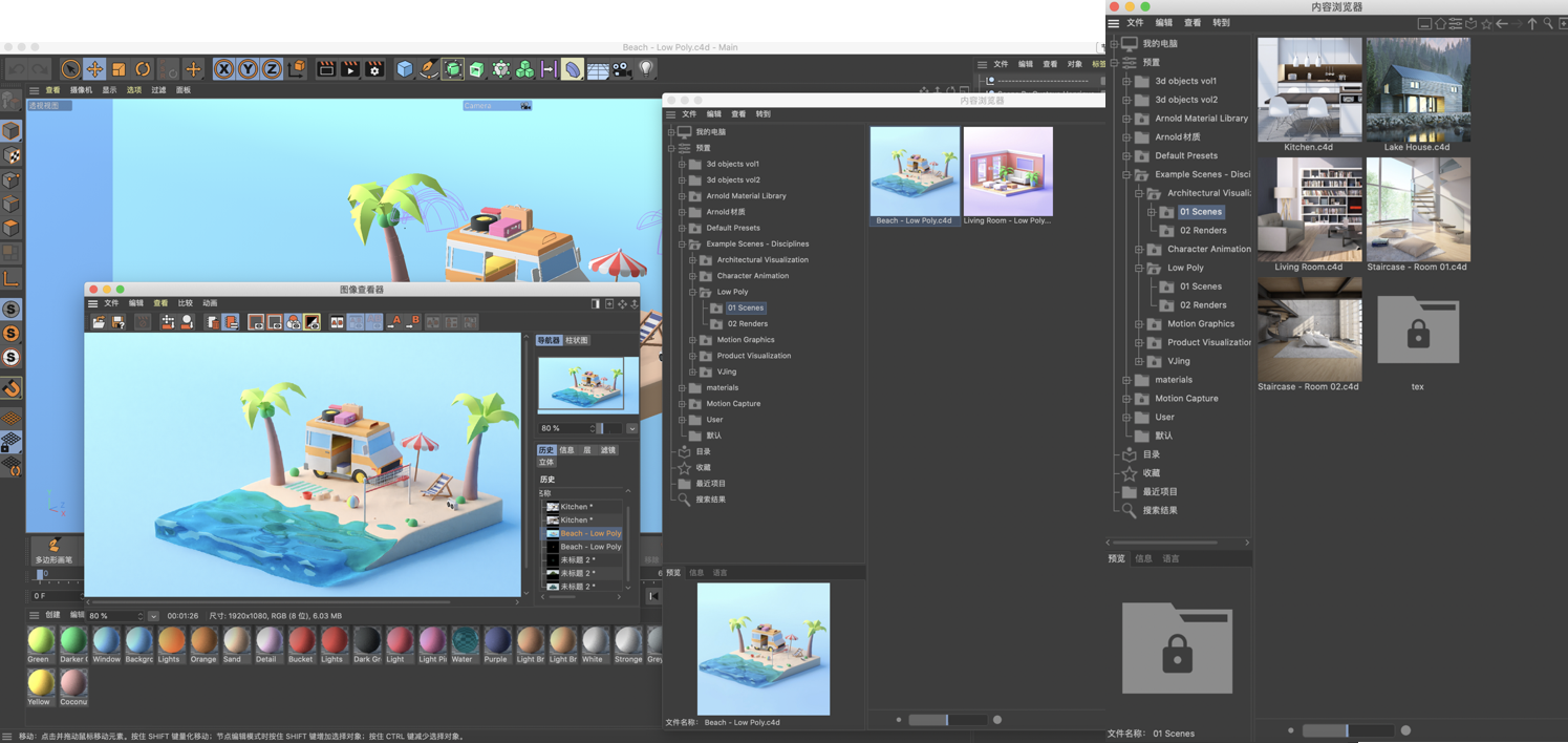 C4D自带的场景预设,大部分是用模型库与材质库里的预设搭建的完整场景。