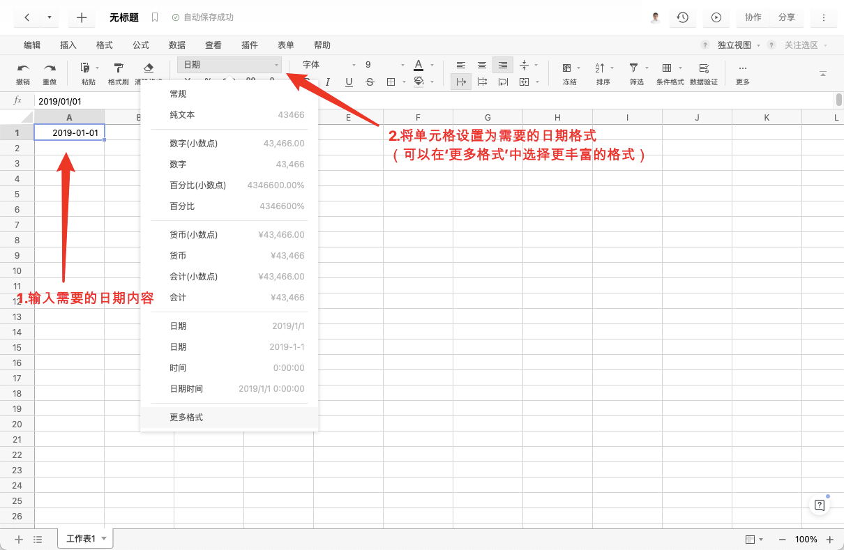 4.1 单元格中插入需要的内容,然后将整列设置为需要的日期格式