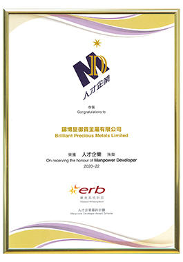 铸博皇御贵金属在“人才培训及发展”方面表现优异,荣获香港雇员再培训局(ERB)颁发的"人才企业"大奖。