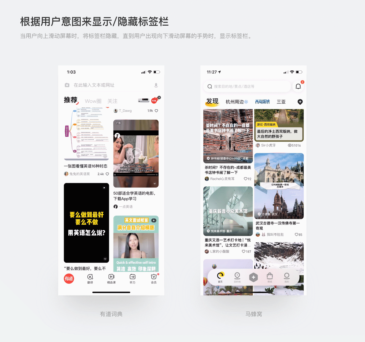 当用户向上滑动屏幕时,我们认为,用户的意图是浏览下方更多信息,此时就将标签栏隐藏,直到用户出现向下滑动屏幕的手势时,显示标签栏,给用户提供便利的跳转操作。