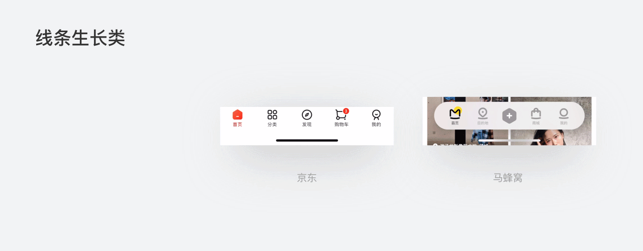 不同状态之间差异度大,用户更容易快速定位所在位置。选中和未选中对应线性和面性两套图标,视觉发挥空间大。是当前最被广泛采用的设计策略。