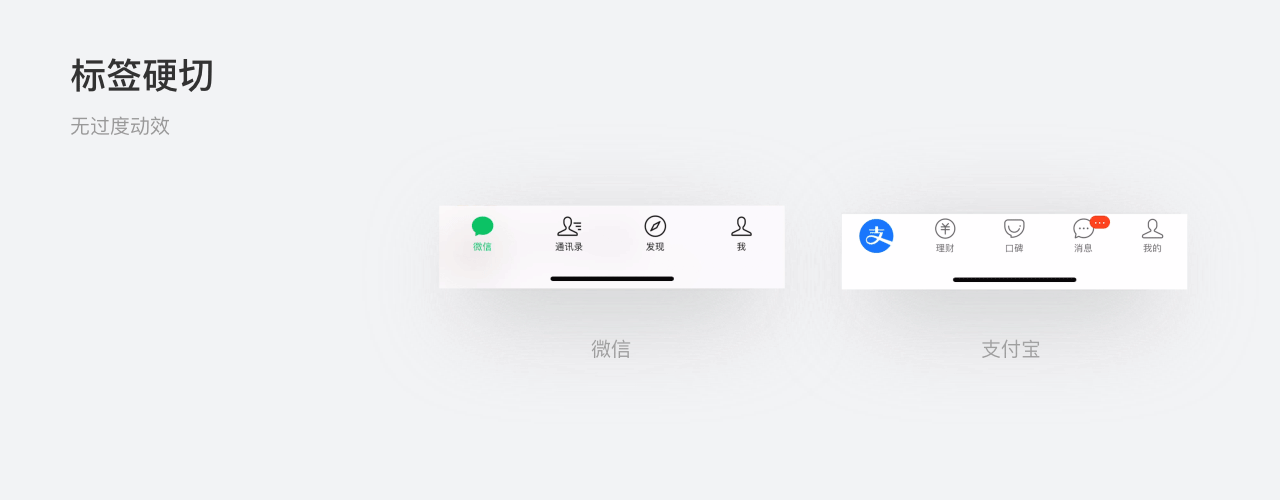 微信、支付宝、钉钉、蚂蚁财富、京东金融、天猫等产品均采用无过度动画的模型。