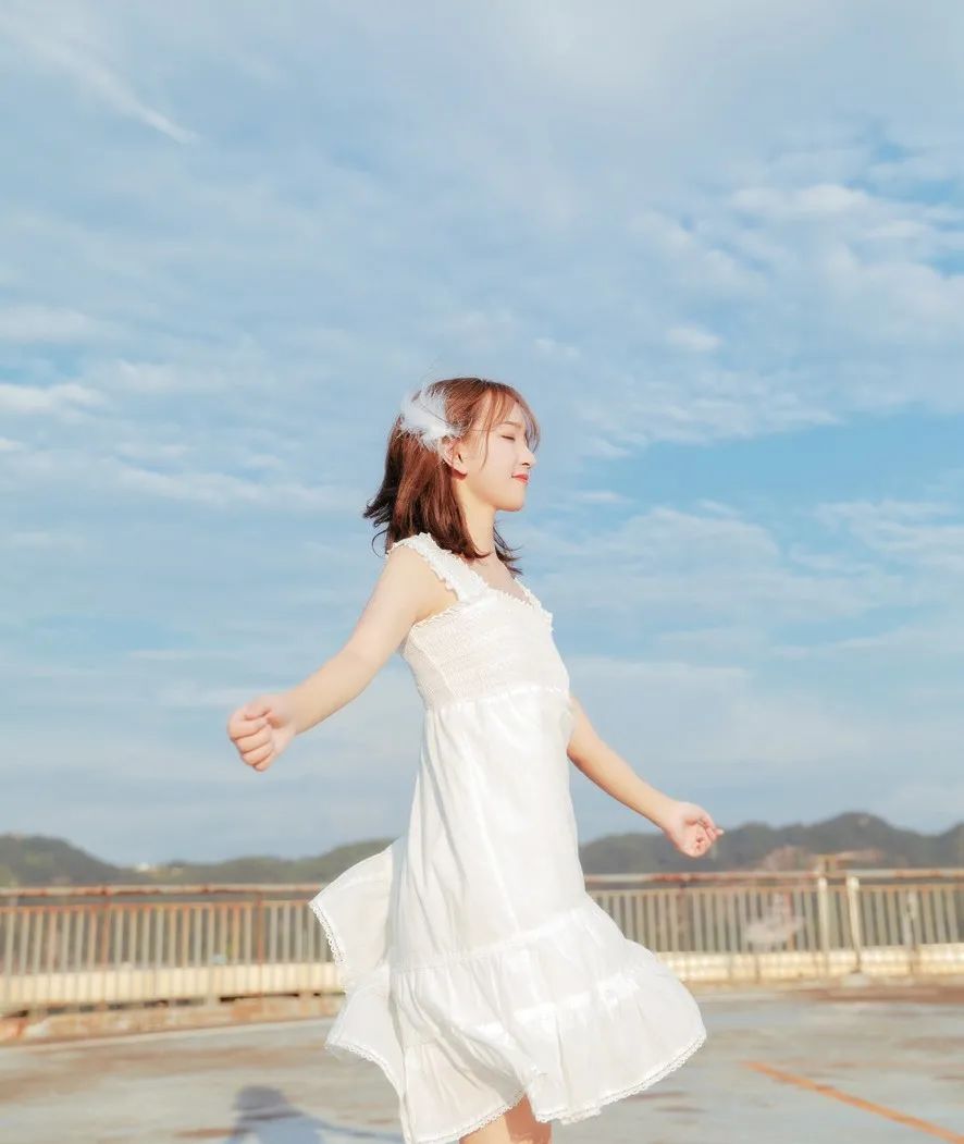 下图中的人物摊开双手,闭着眼睛,伴随着裙子和手臂自然地摆动,慢慢转圈。这样一个简单的动作就能让照片显得更加生动。