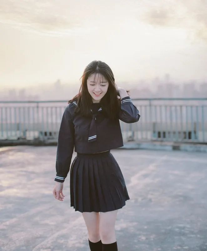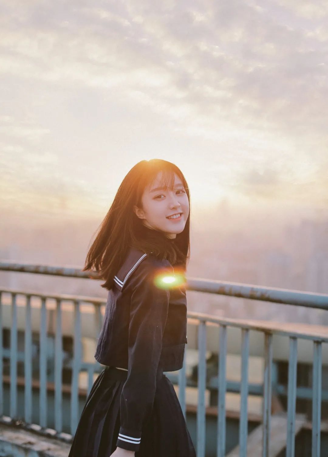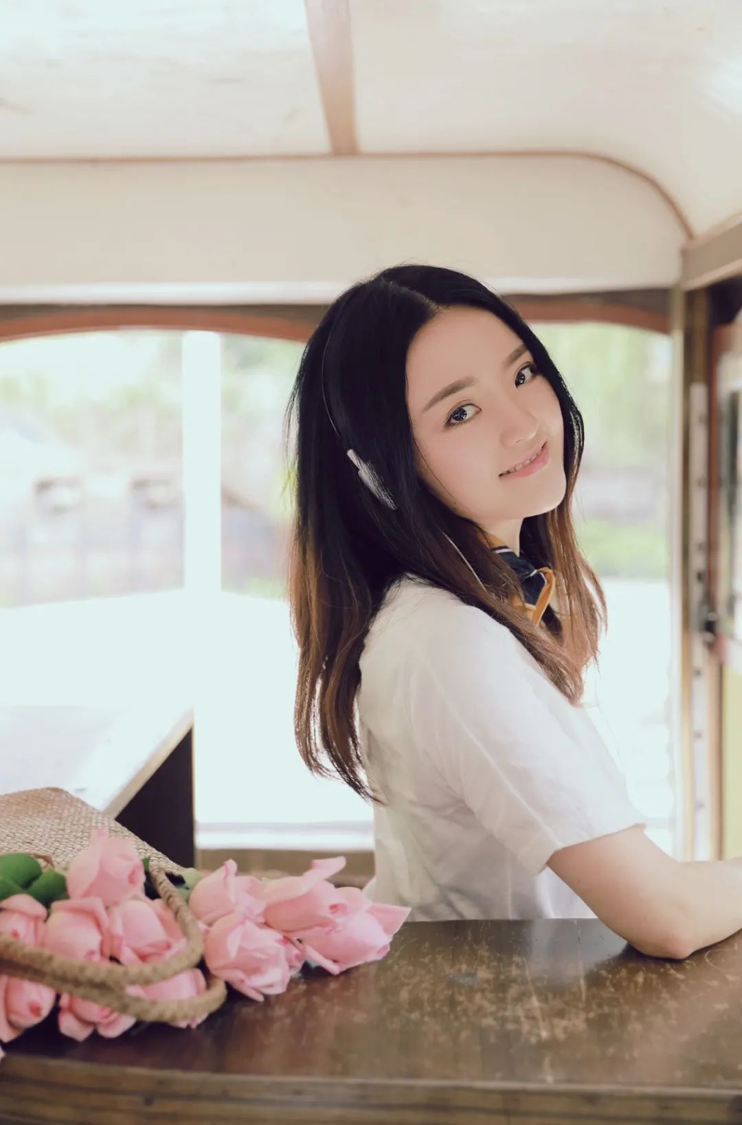 下面这张照片中的人物侧身站着,戴着耳机,眼睛看向镜头,甜甜地笑着,显得少女感十足。