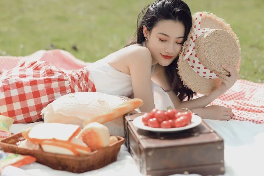 下面这张照片展现的是一个下午茶的情境,模特轻松悠闲地趴在野餐布上,闭着眼,微笑着。野餐布上有水果、面包和零食,贴合下午茶的主题。人物很自然地融入了环境,最终得到一张内容丰富的人像作品。