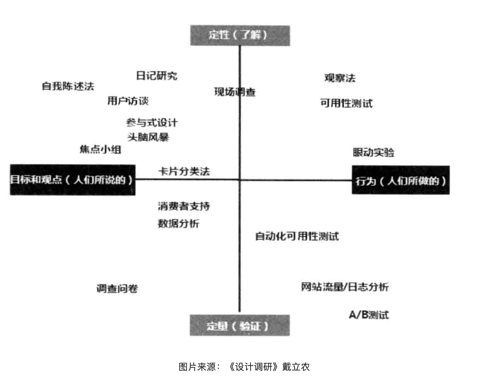 常见的研究方法有很多,将这些方法划入象限的方式,x轴为人的行为,y轴为方法的性质类别。在产品不同的阶段我们会采用相对适合的研究方法,也可能交叉使用。在这里治记录了常用的几个方法,并没有针对性的详细讲解。