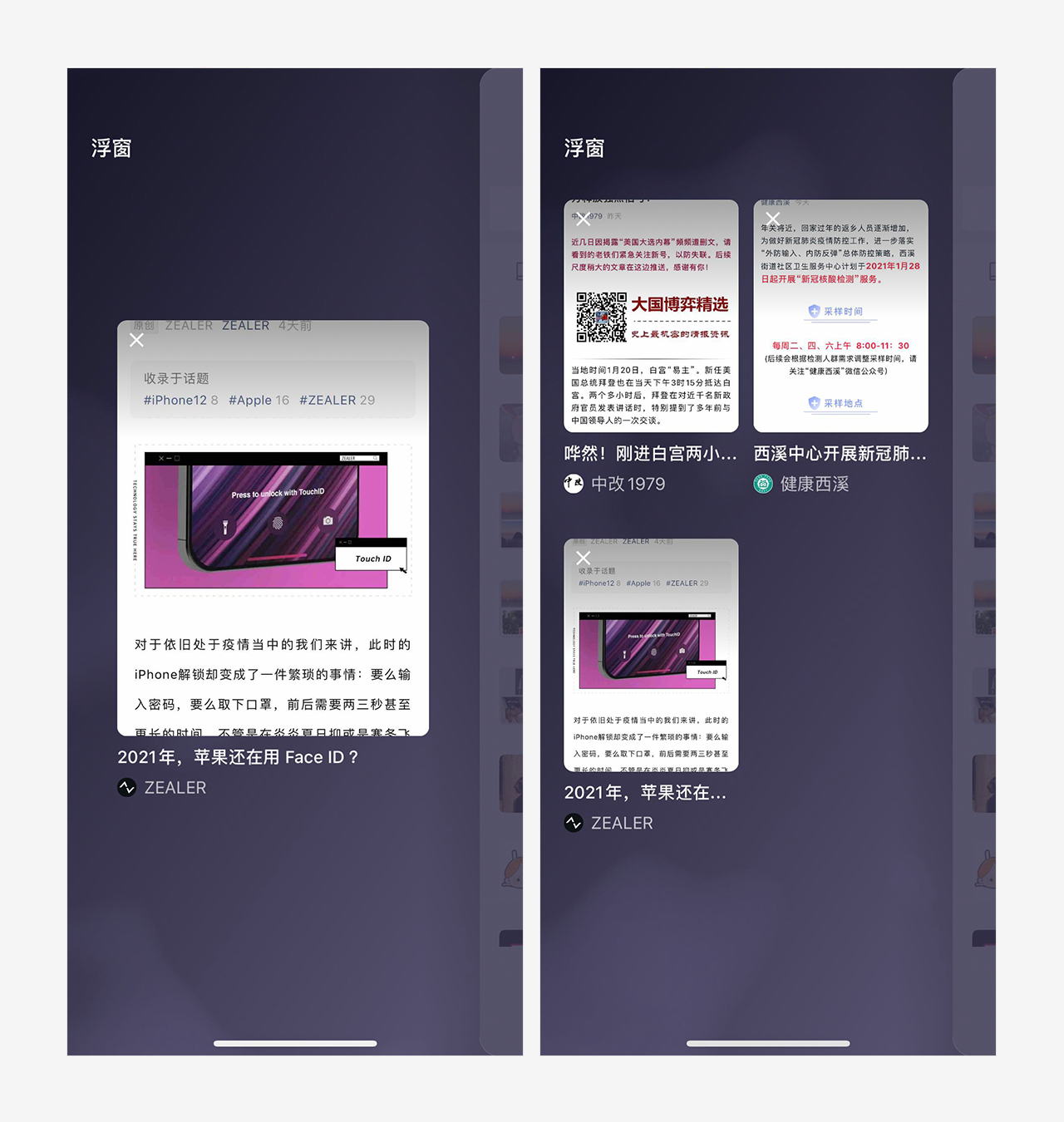 优点:取消始终悬浮在微信上,避免阻挡用户浏览视线。原悬浮功能点击后出现标题列表,新版本则浮窗显示标题、图片及账号,优化预览效果,功能上也相对独立、不干扰。(不知道是微信官方想弱化这部分功能而选用该图标还是设计师的问题,此处的浮窗按钮跟右侧的图标看起来不是很和谐,本人拙见,勿喷);