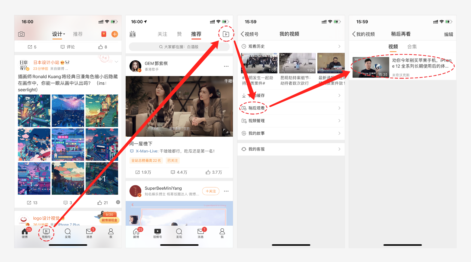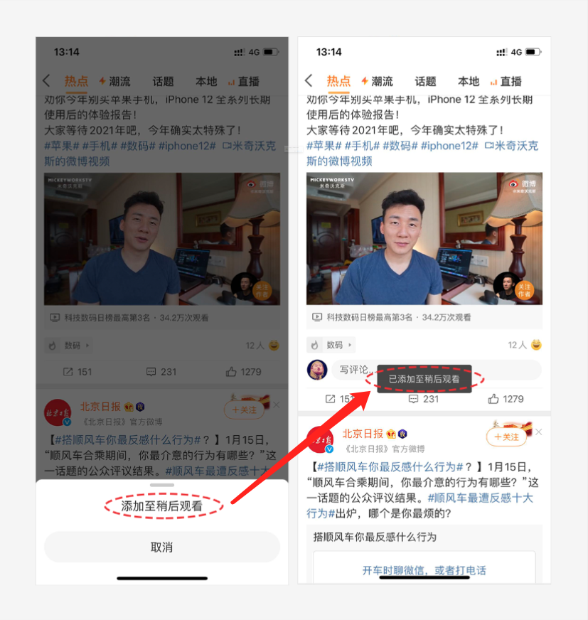 微博-添加至稍后观看功能:当用户浏览微博视频内容时,或许受视频长度、流量、空间、时间等因素暂时无法观看视频,或者对内容质量不确定但有兴趣想看,用户可长按视频将本视频添加至稍后观看,之后用户如果想继续查看视频可以进入视频内容页,点击右上角视频按钮后进入稍后观看列表查看视频。