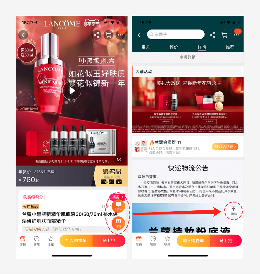 节省用户查看评价、详情的时间,点击按钮可直达用户所要查看的内容,方便快捷,必要时将其隐藏避免功能重复,避免阻挡商品详情内容的展示。