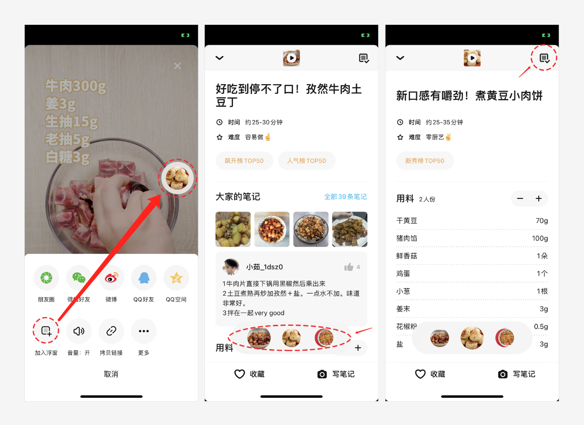懒饭-浮窗:作为厨师小白在看菜谱学烧菜时,在选定多个菜单时,往往需要看完当前菜谱之后搜索下一道菜的菜谱或者到用户收藏夹寻找下一道美食菜谱,相对来说较繁琐,添加浮窗功能,用户可以将多个菜谱添加浮窗,用户可以自由切换查看菜谱 ,查看完成之后点击右上角可以删除本菜谱到浮窗。