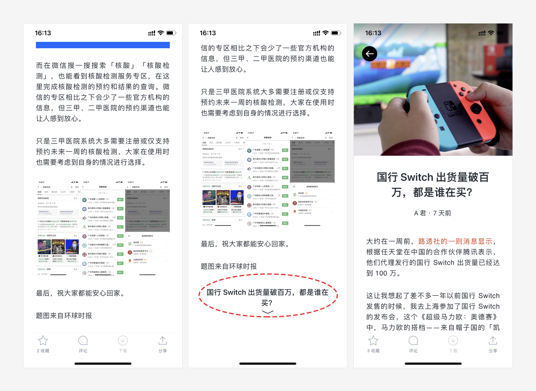 优点:滑动查看下一篇文章,用户不再需要点回资讯列表点击查看下一篇文章,节省用户操纵时间和路径,能让用户快捷的阅读下一篇文章,使用户阅读更加流畅,给用户沉浸式阅读体验。同时还提高了文章的阅读量。