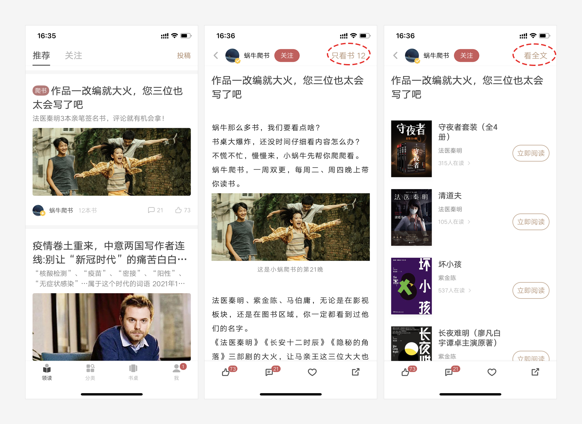 只看书:在阅读书单推荐文章时,文章内部往往会穿插着作者想要推荐的书籍链接。有的用户喜欢看推荐理由,而有的用户喜欢直接查看书单。网易蜗牛读书为想要直接查看书单的用户提供了快捷方式,点击详情页右上角“只看书“,用户即可快速get文章中推荐的所有书籍,并且可以直接阅读。