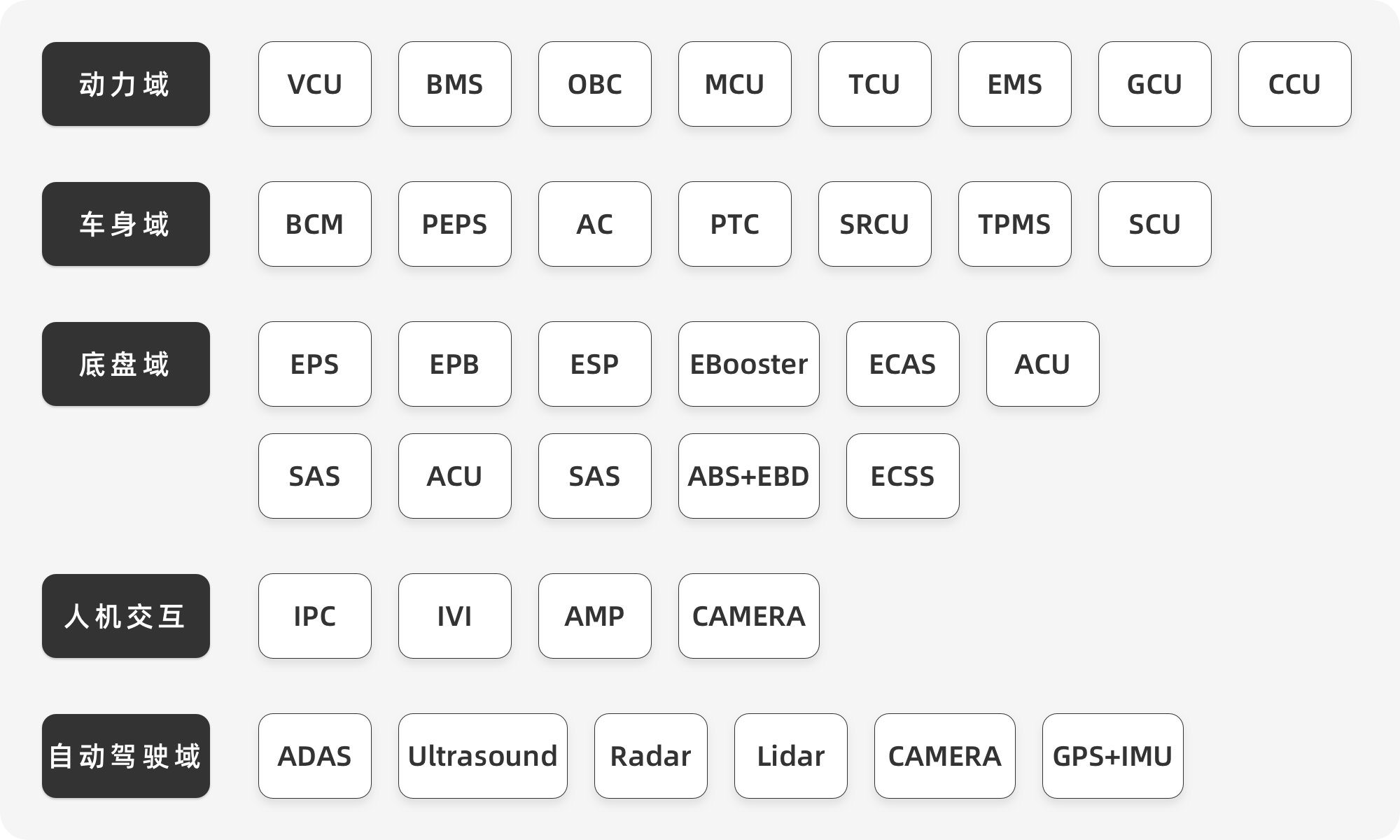 我们使用手机app,通过手机和服务器通讯,实现数据的显示、下载更新等功能,通讯比较单一。而汽车的通讯比手机复杂的多,涉及到汽车的电子电气架构,一辆车存在多个单独处理的系统,分为几大域:动力域、车身域、底盘域、人机交互域、自动驾驶域。如下图: