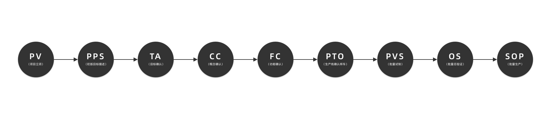 1.PV(项目立项) 2.PPS(初版目标描述) 3.TA(目标确认) 4.CC(概念确认) 5.FC(功能确认) 6.PTO(生产线确认样车) 7.PVS(批量试制) 8.OS(批量总验证) 9.SOP(批量生产)
