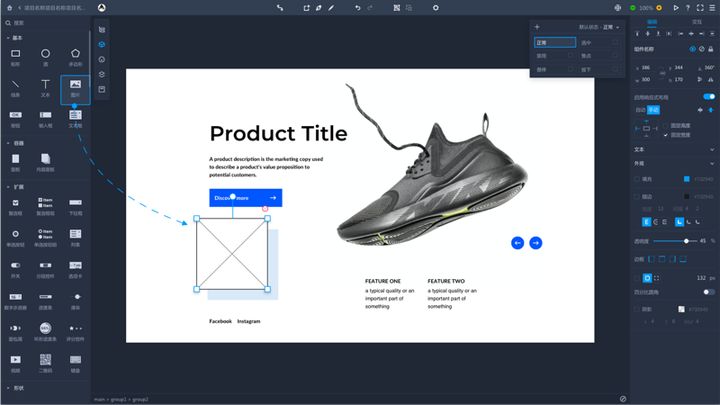 自带交互效果的预设组件、海量图标、便捷的编辑方式,快速产出设计。