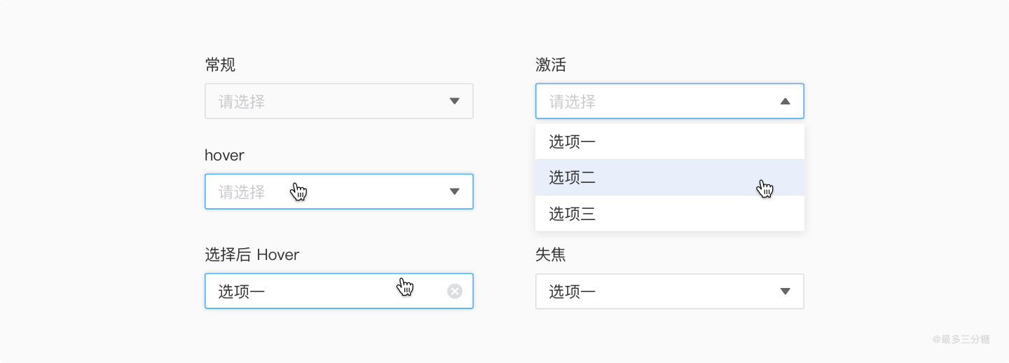 样式有点像输入框,不过多了一个三角下拉框,建议选项最好在8个以内,超出用滚动条展示,用户体验会比较好。
