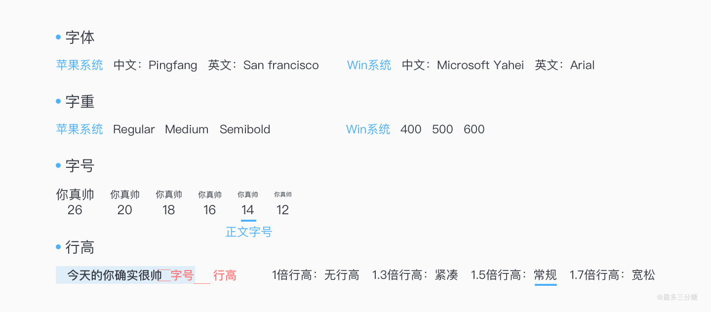 不同系统的字体是不同的,字重表现形式也不同,字号大小不建议设置太多种,一个页面字号层级越多,页面会显得越乱,所以也要保持克制。正文字体一般采用14号字号,如果有些系统页面不多-“地广人稀”,正文字号用16也是可以的。
