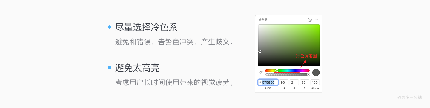 色彩中最重要的是主色,尽量选择冷色系,避免和错误、告警色冲突,产生歧义。比如红色就会和错误色冲突,这样错误警示色就不容易被发觉。并且避免高亮颜色,类似与荧光色。