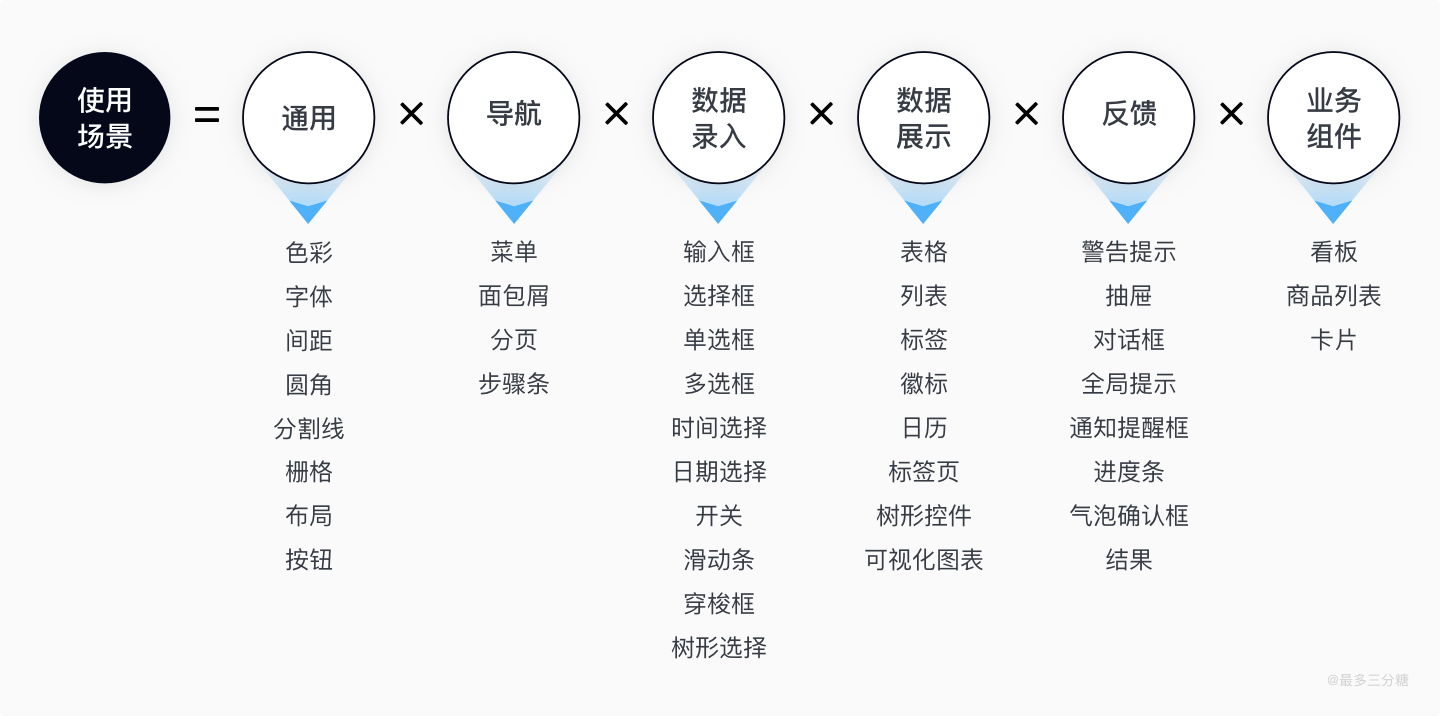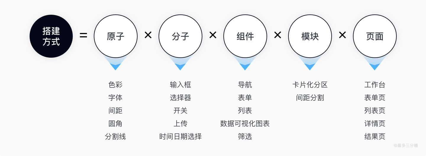 从两个角度去分析,从搭建方式我们应遵循由小到大,可分为原子-分子-组件-模块-页面。就像盖楼房一样,一块块砖叠起。从使用场景来说,不管是做C端还是B端都遵循通用-导航-数据录入-数据展示-反馈-业务组件