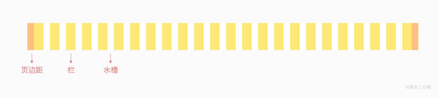 栅格由栏、水槽、页边距组成。一般由24栅格组成(24栏+23水槽+2页边距),使用栅格会使页面看起来更加整洁也有利于前端开发响应式(关于自适应和响应式区别讲解链接在文章末尾)