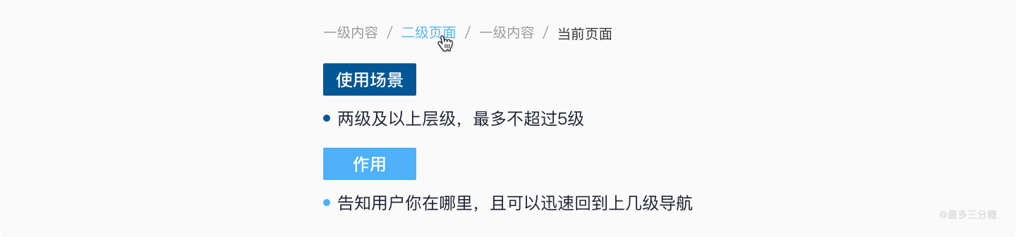 面包屑就是页面内的导航,是我们跳转多个页面后也不会迷路的组件。每一级导航点击后,都必须要有页面承载。