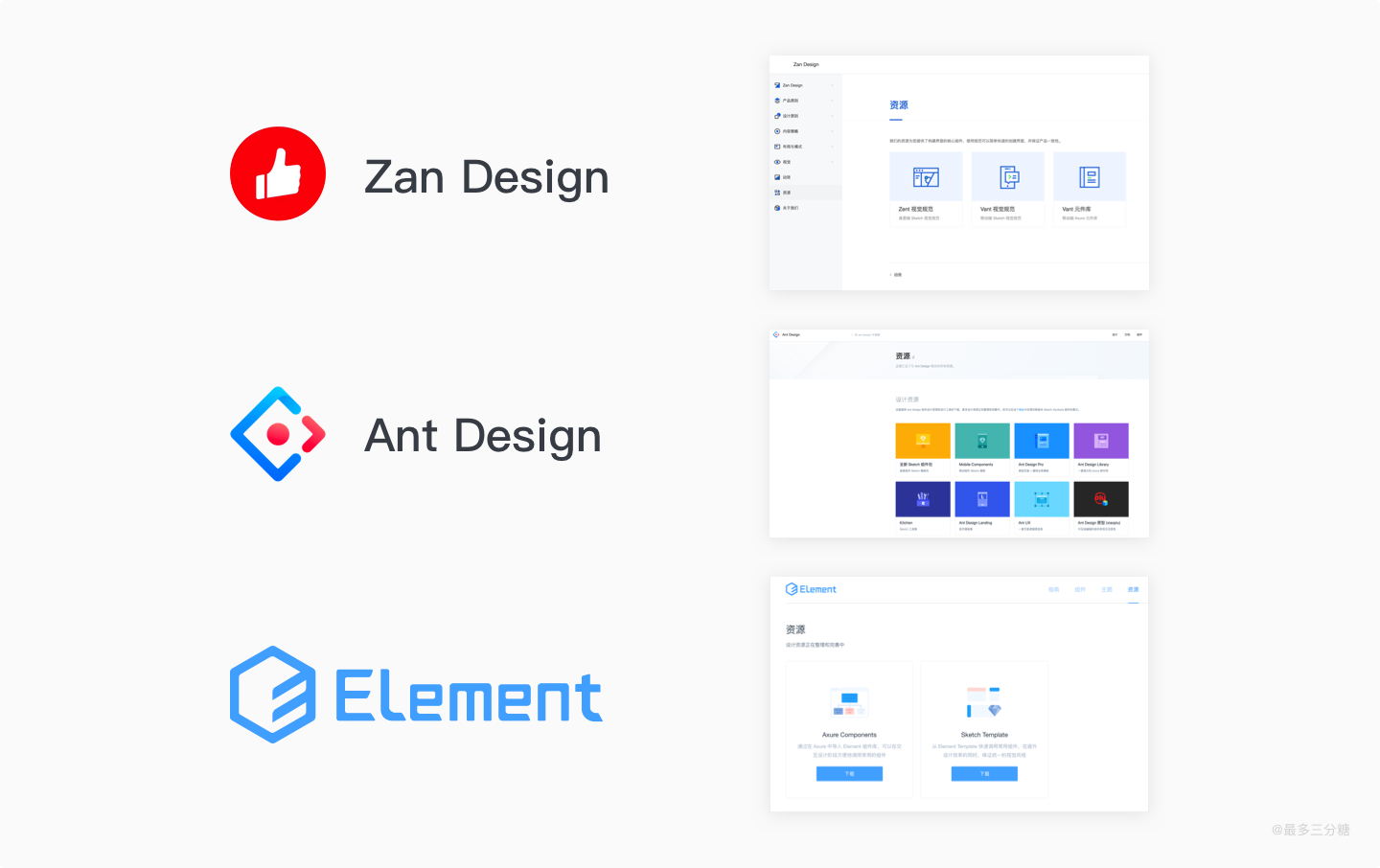 Zan Design、Ant Design、Element都是国内比较值得参考的组件库,如果我们想做一款B端产品,可以从这几个组件库中参考,并设计延展出一套有以自己品牌基因的组件库,这几大组件库可以当做字典参考,而非零到一去创建一套组件库。(网页链接放在文章末尾)