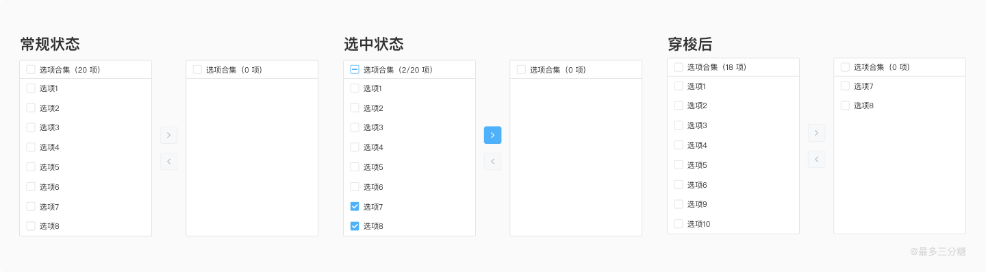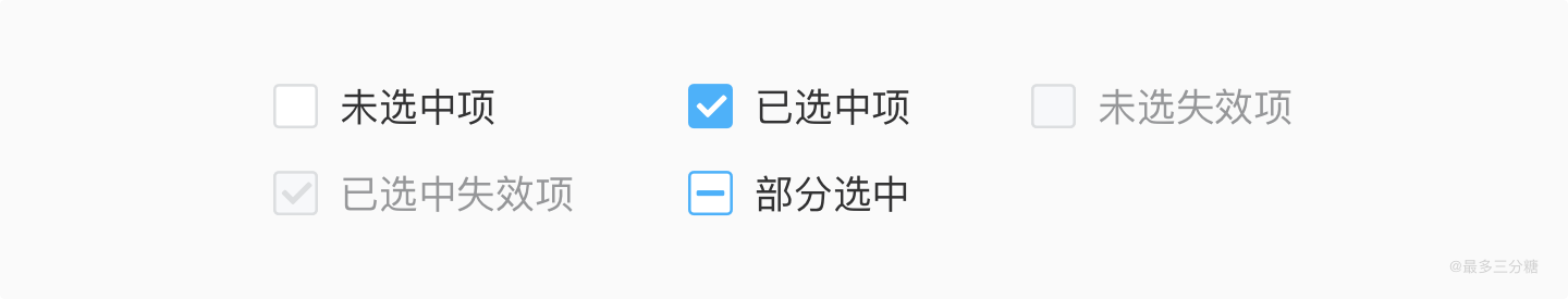 多选框相比单选多了一个部分选中的状态。多选框的应用非常广泛,例如表单、表格、下拉框。