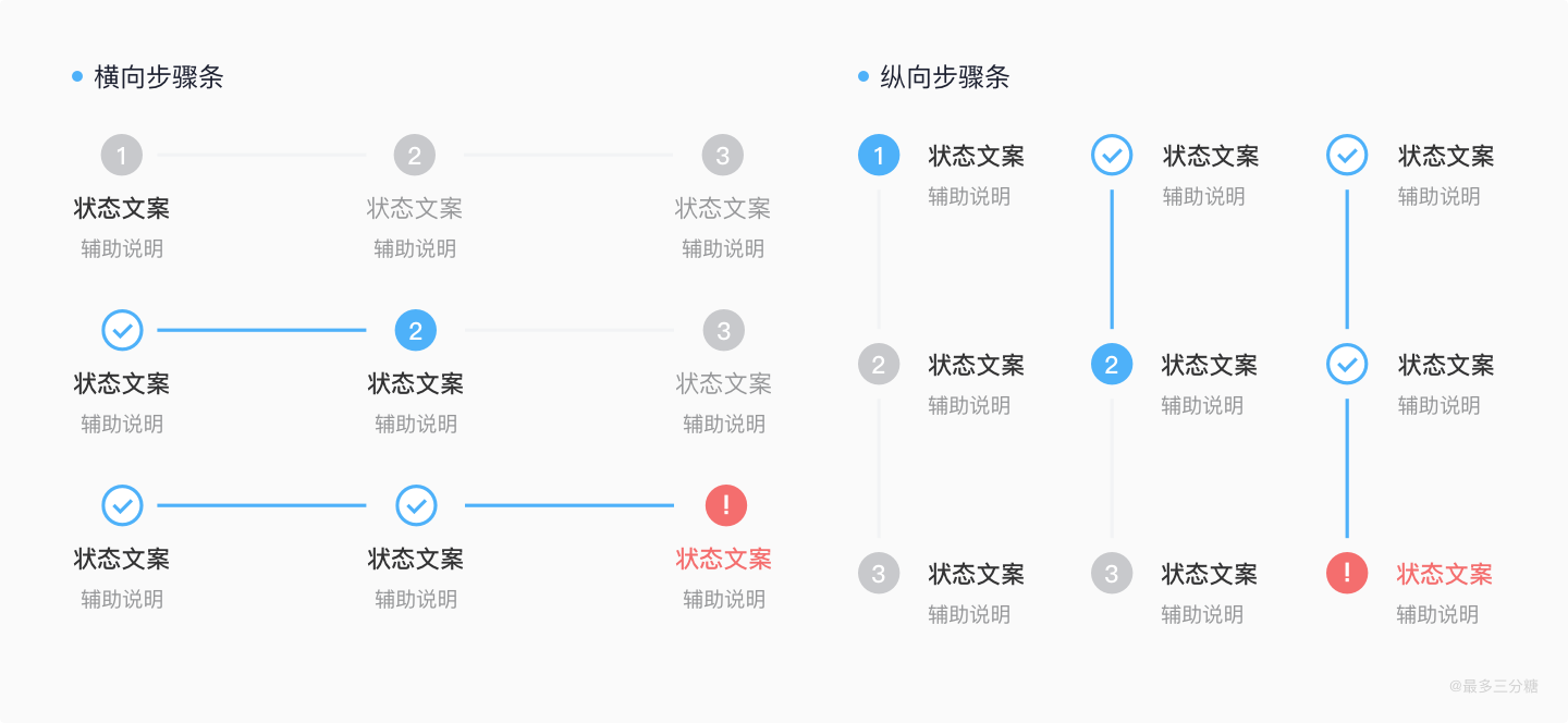 步骤条能让用户清晰知道自己进行到哪一步。当任务复杂或者存在先后顺序,将其分解成一系列步骤,从而简化任务。