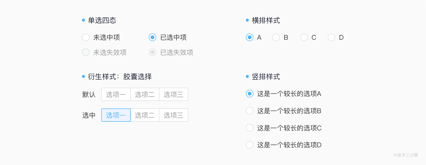 单选框可以分为横排样式和竖排样式,当文案较少时候可以使用横排,节约展示空间。胶囊样式点击面积更大,同时更强调选项。
