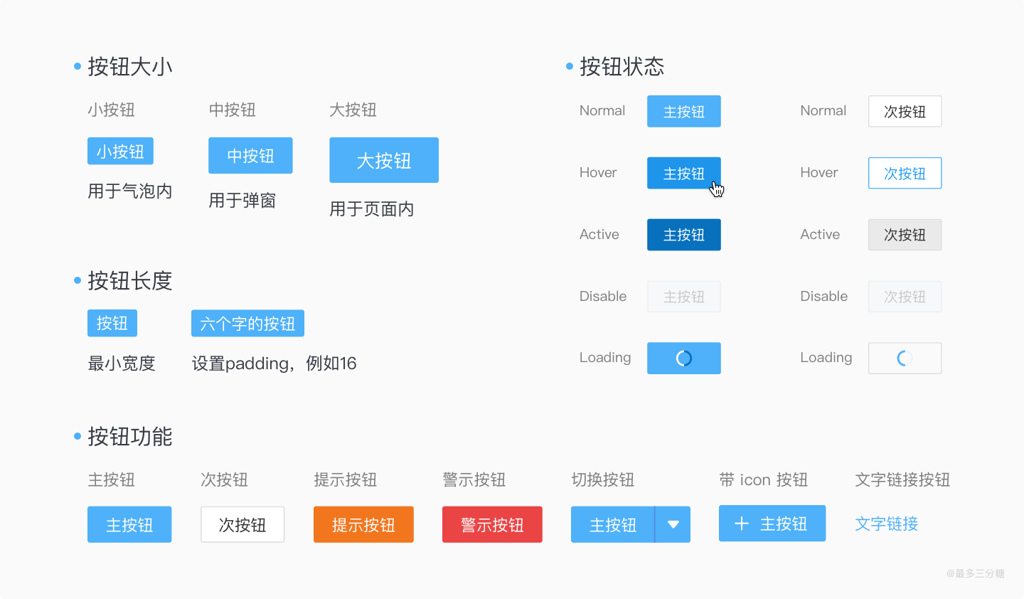 按钮分为小按钮,中按钮,大按钮。小按钮一般是气泡提示,中按钮大部分用在弹窗组件,大按钮用于全局性的页面里。定义三种按钮尺寸就足够用了。按钮长度最好不超过6个字,边距长度也需要定义,例如16px。