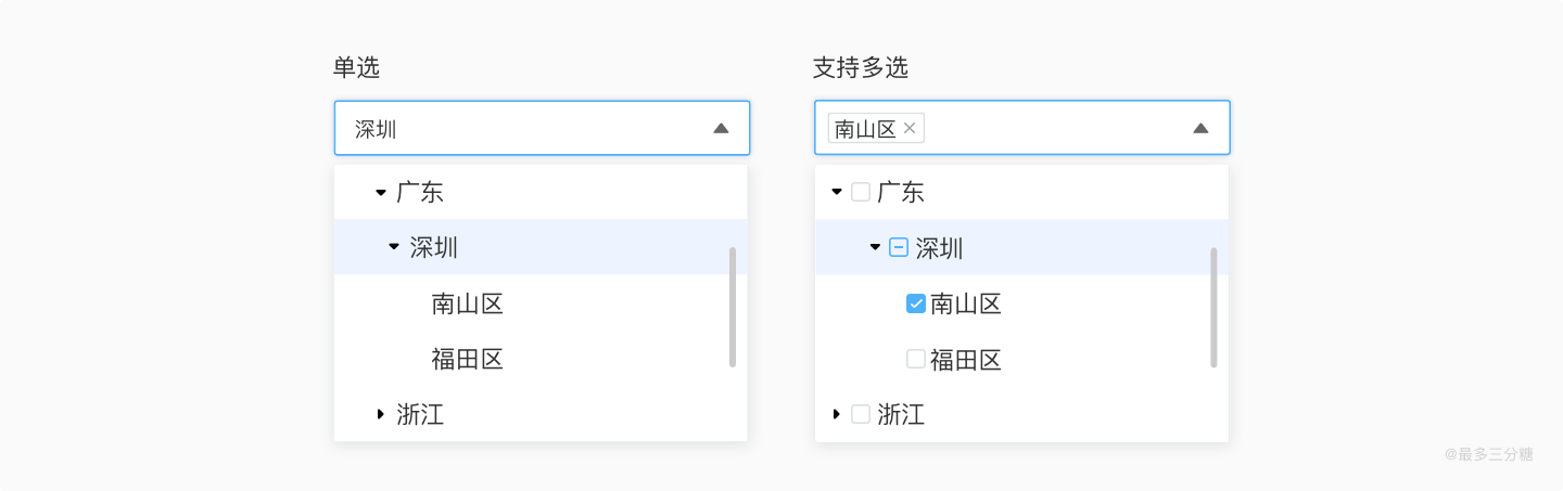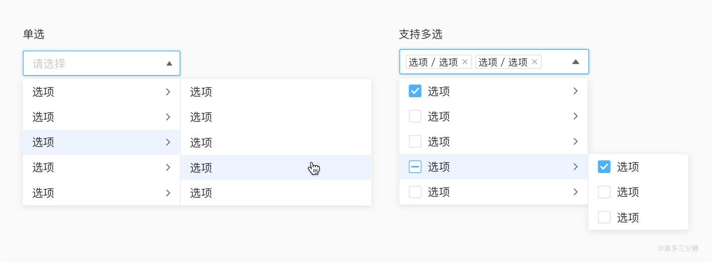用于选项很多且有分组的情况。以下展示的二级选择器,当然我们也可以加到三级和四级,级联越多用户体验越差,所以我们要考虑业务需要去抉择。