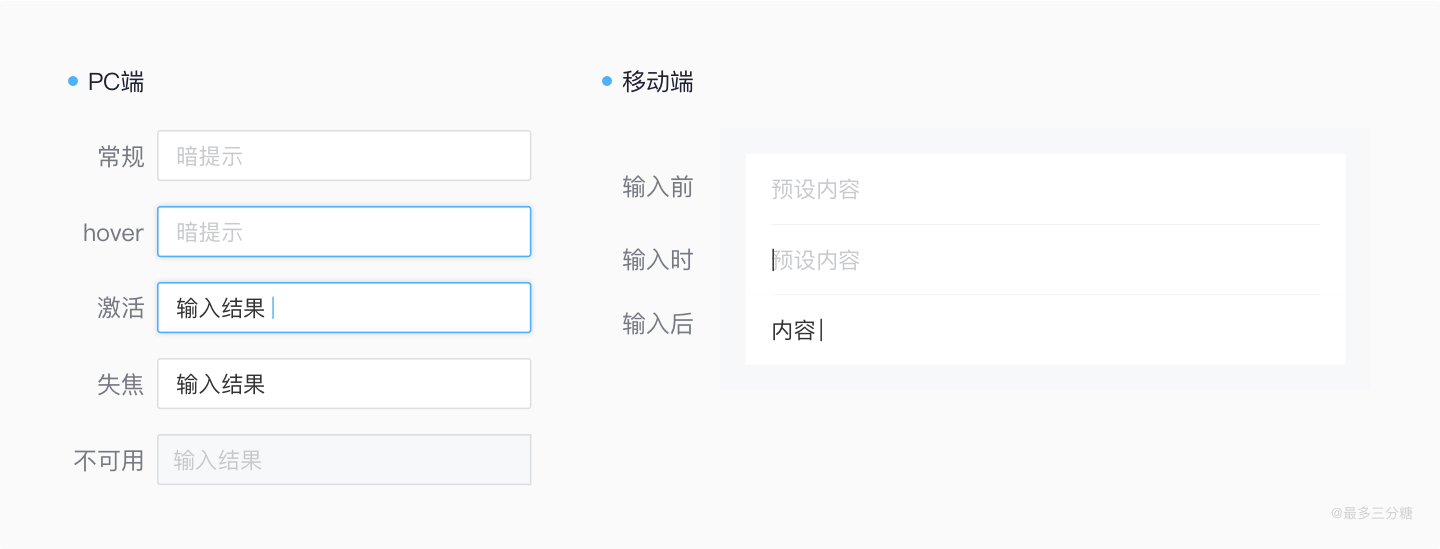 PC端和移动端的输入框不同的点是PC端有五个输入状态,体现出及时反馈原则。