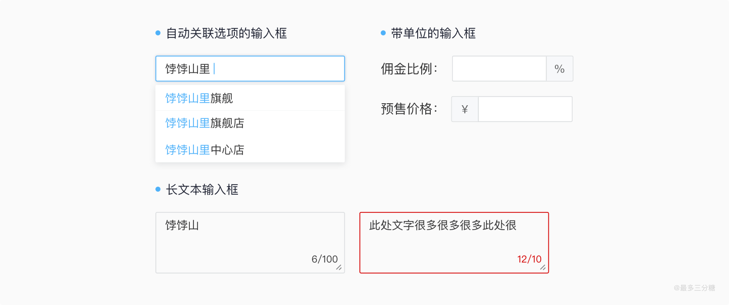 当输入长文本框时候会限制字数;有些输入框一输入就会出现关联词提示下拉框(带搜索属性),有些输入框会固定单位。