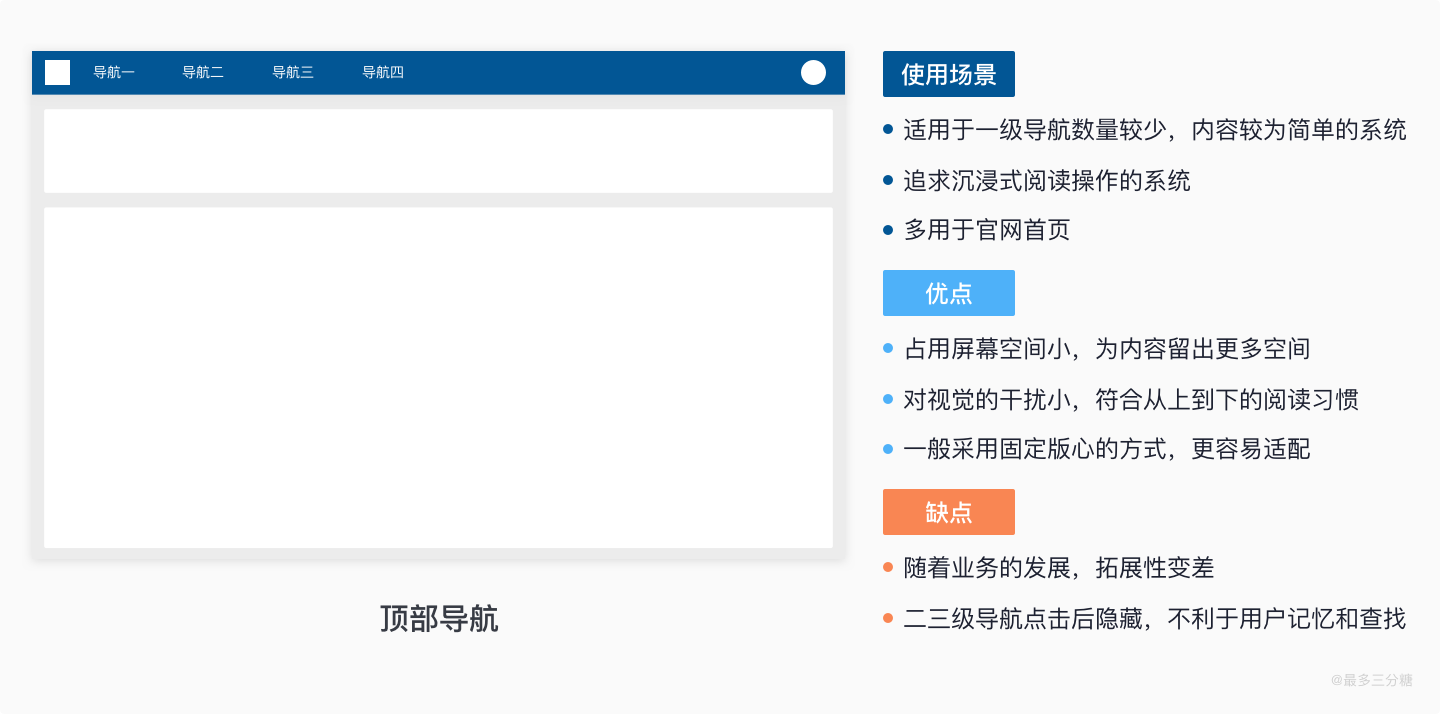 只存在于顶部的导航,不占用左右边位置,适用于一级导航数量较少的系统,优点是让用户使用的时候有沉浸感。