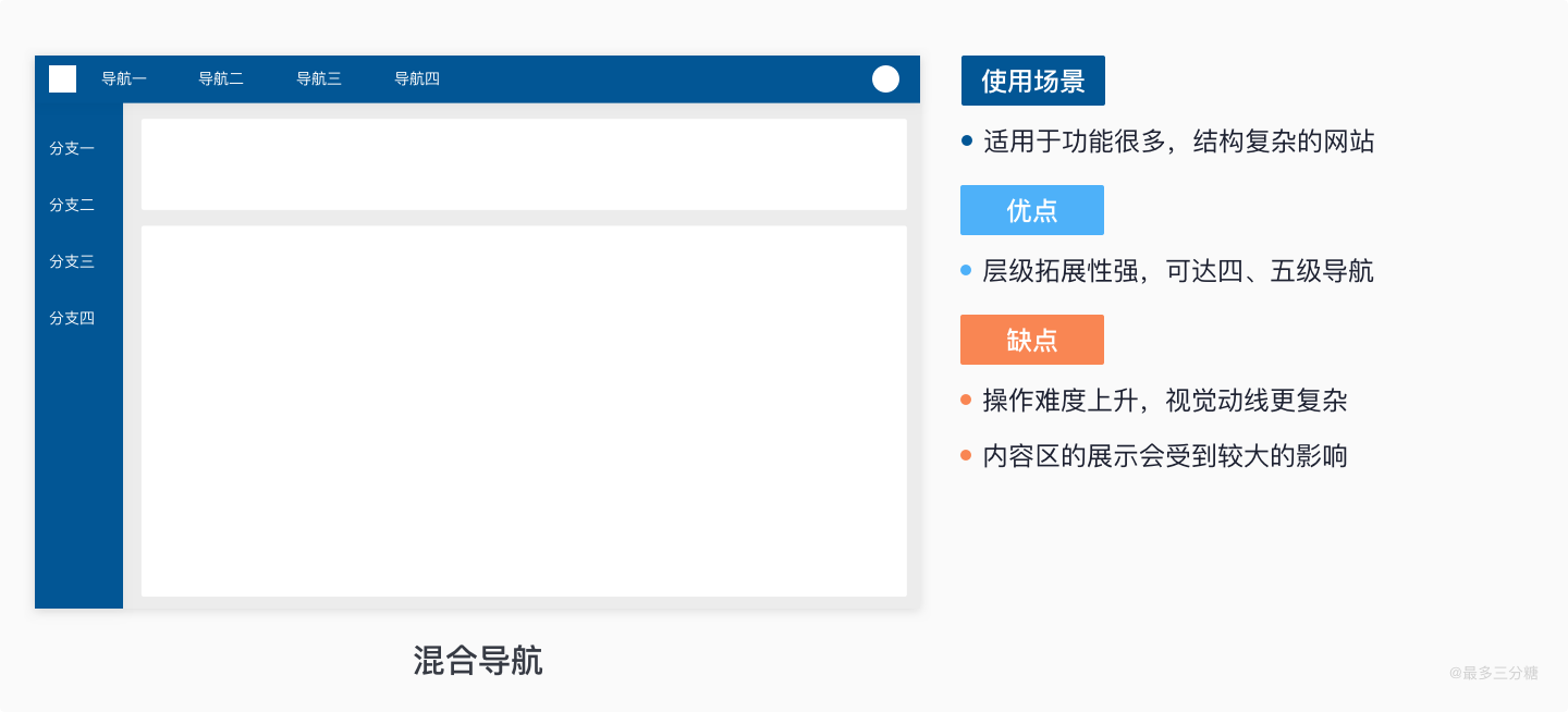 混合导航是既有顶部导航又有侧边导航,一级导航是顶部导航,侧边导航为二级。