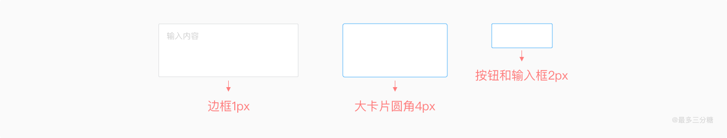 边框加圆角就可以组合成一个组件。边框一般用1像素,小组件例如按钮,输入框圆角定于为2,大卡片为4。B端设计一般偏理性简约,不会用一些大圆角,儿童活泼风格的除外。