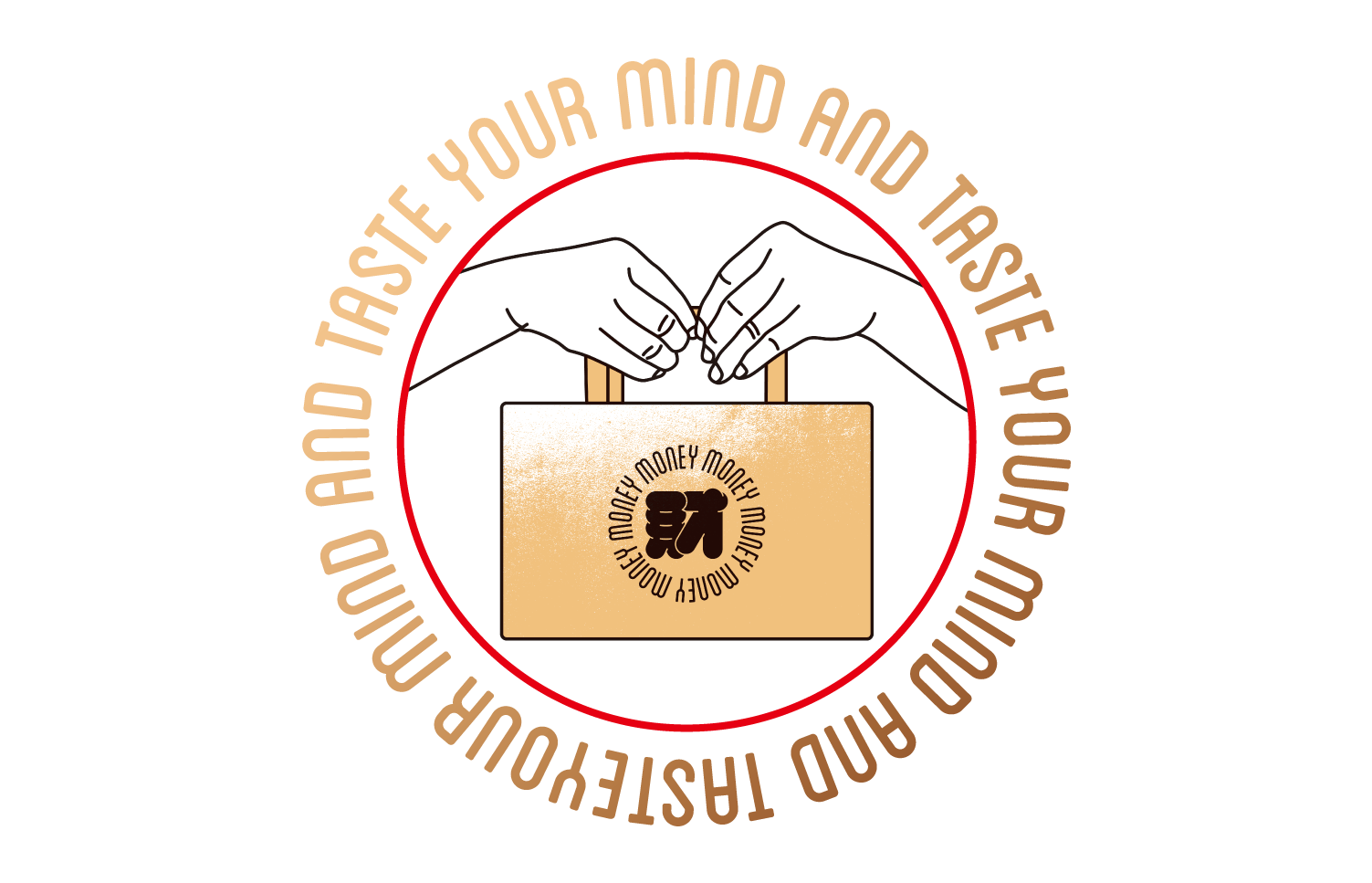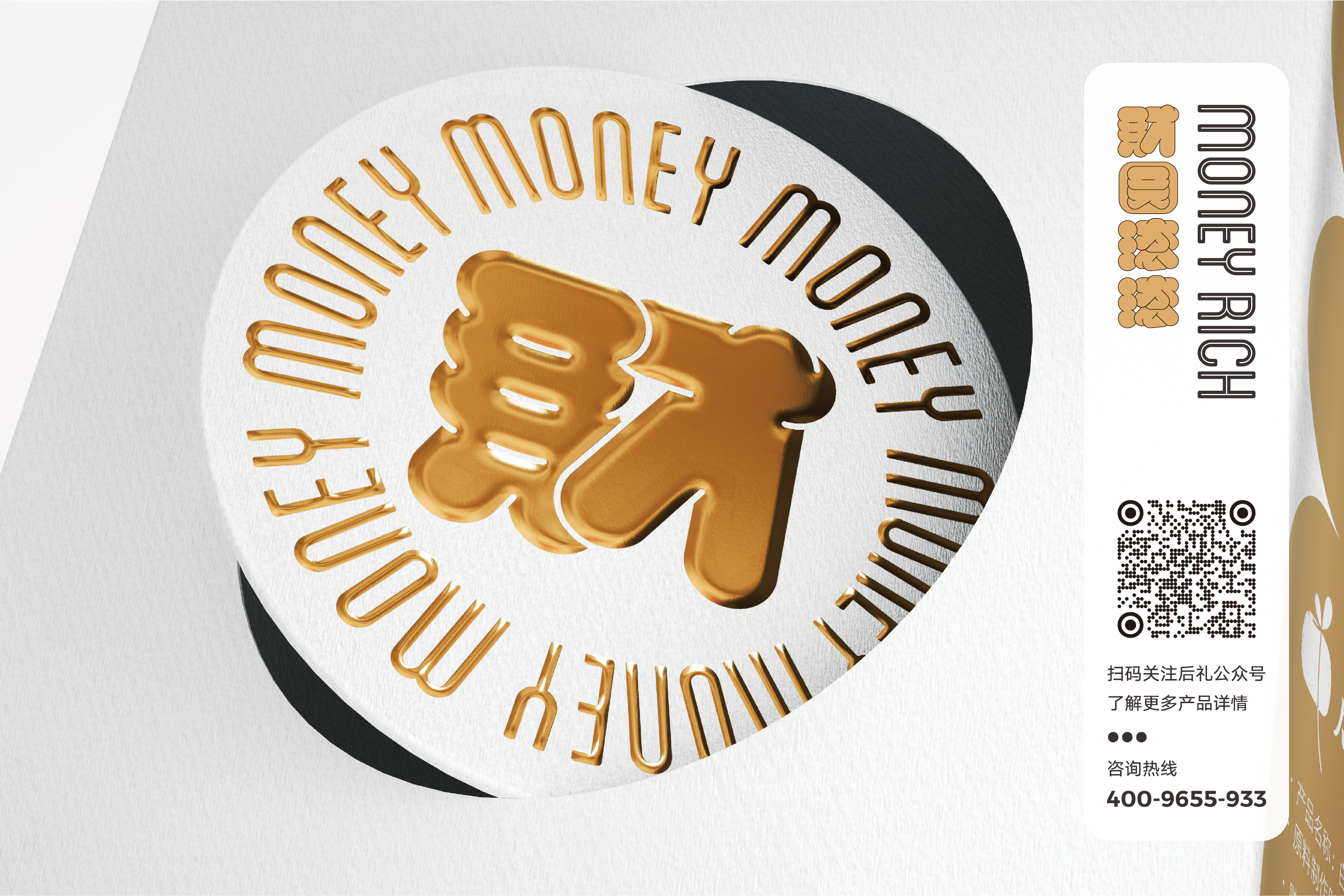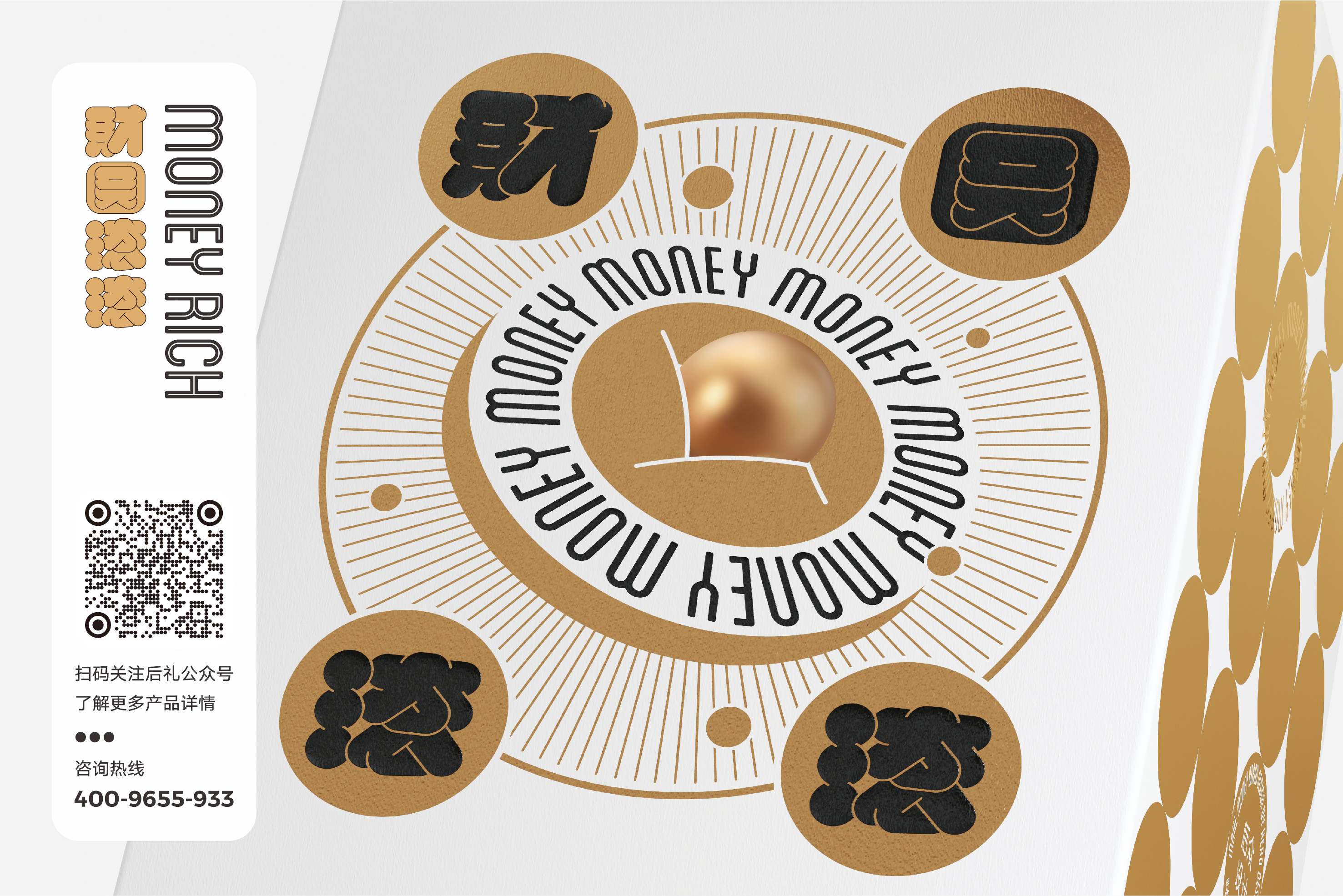 铜钱中央跃出的金色球状形态,喻意财富自内迸发,创业如做人,只有坚守内心规则,自有财富滚滚涌来。周边的MONEY字母绕圆而行,配合周边如阳光般的光线形态,财圆滚滚于身畔环绕,表达了对于纳礼者的真诚祝福。