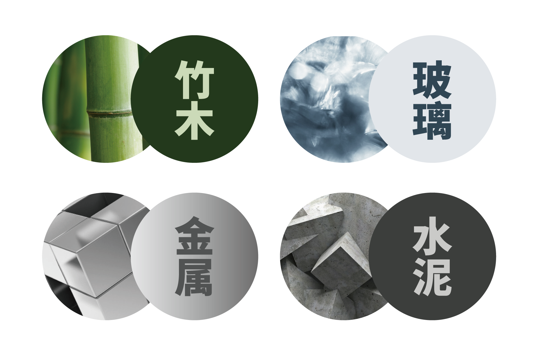 不同的材质有着不同的质感与心理感受,竹木和纸张材质,传递人们对于自然的感性认知;金属略显坚硬,形态挺拔且充满力量感;玻璃则剔透轻盈,明亮中透露着时尚感;而水泥等建筑材质则充满着对于生命丰富的厚重感……