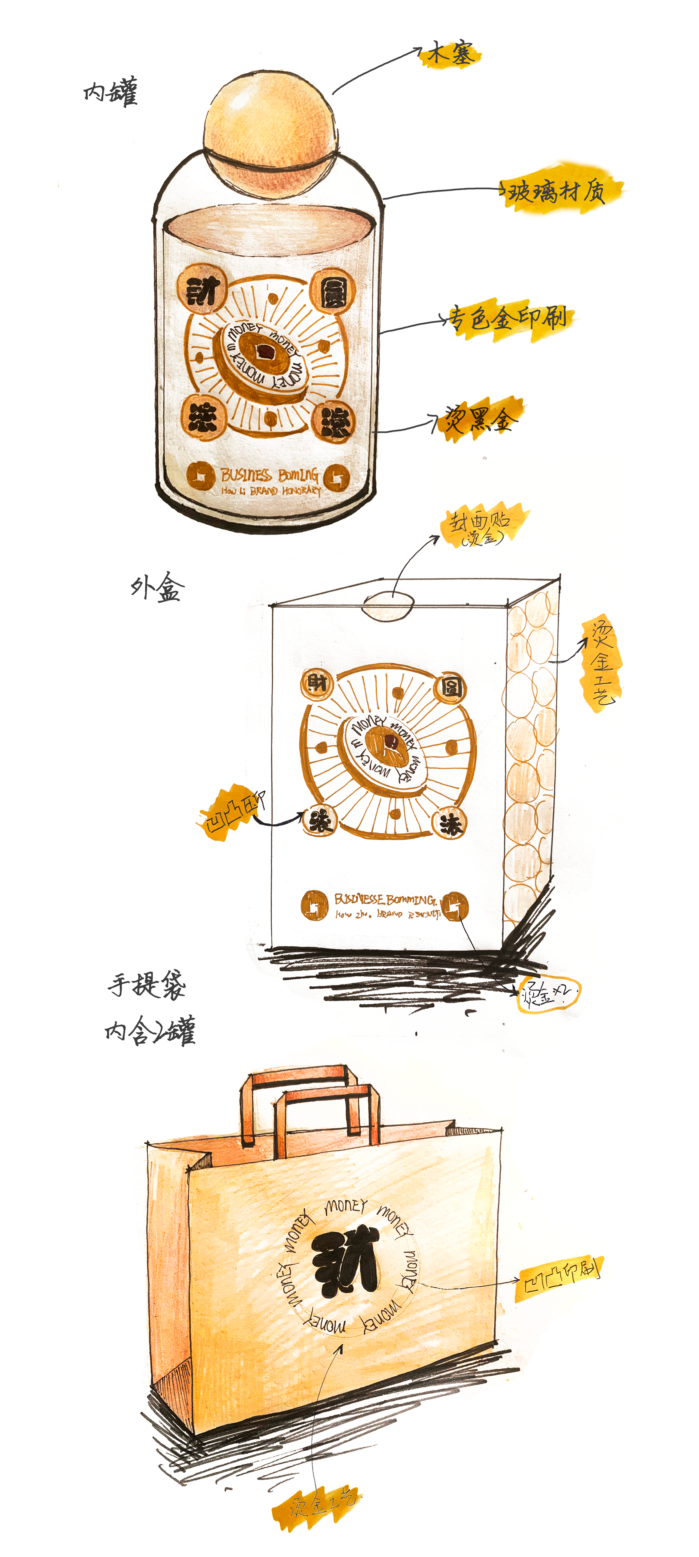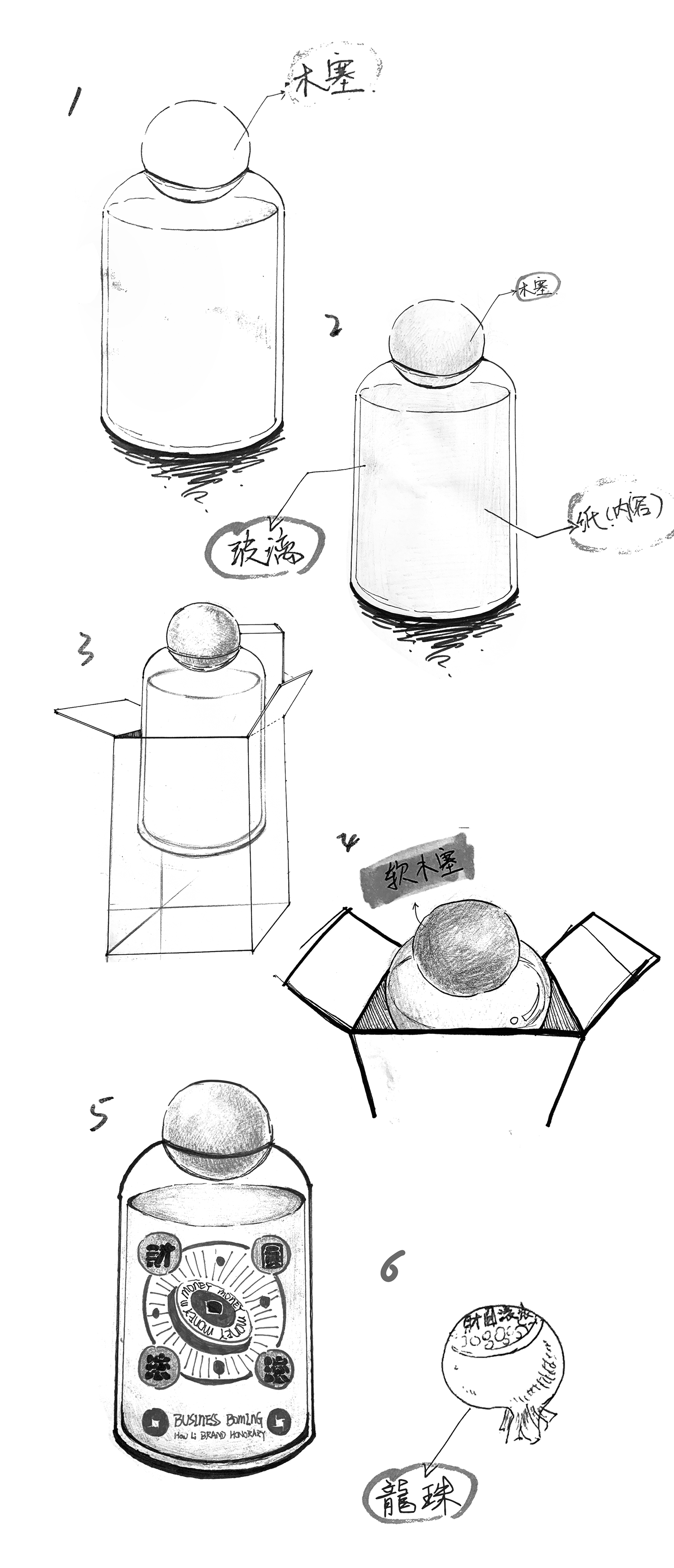 纸盒、金属、玻璃、竹木甚至水泥,后礼团队把能想到的材质样式逐一思考实践,最终选定了以玻璃瓶做为产品的内瓶包装,纸盒为外层包装的基本形式,完成对财圆滚滚产品包装的设计与落地。