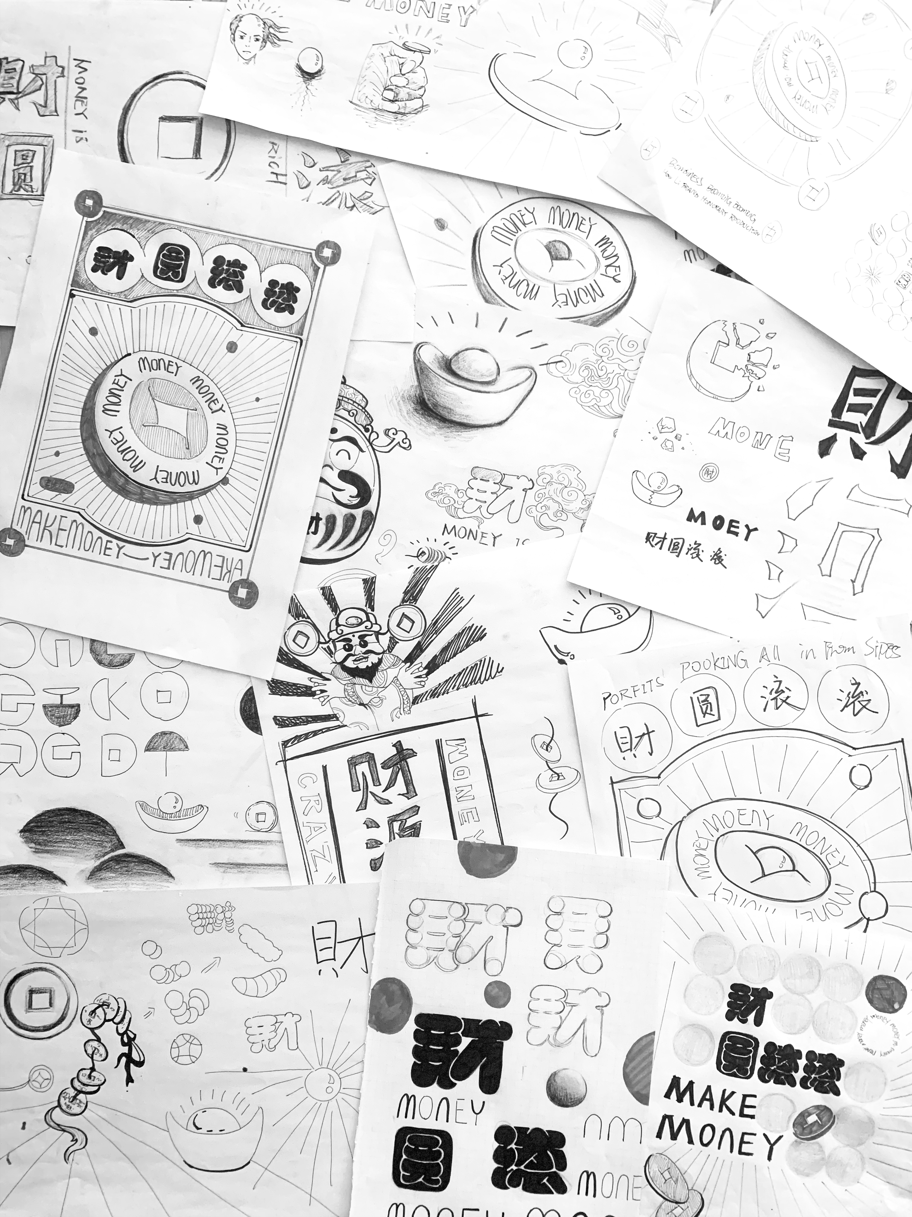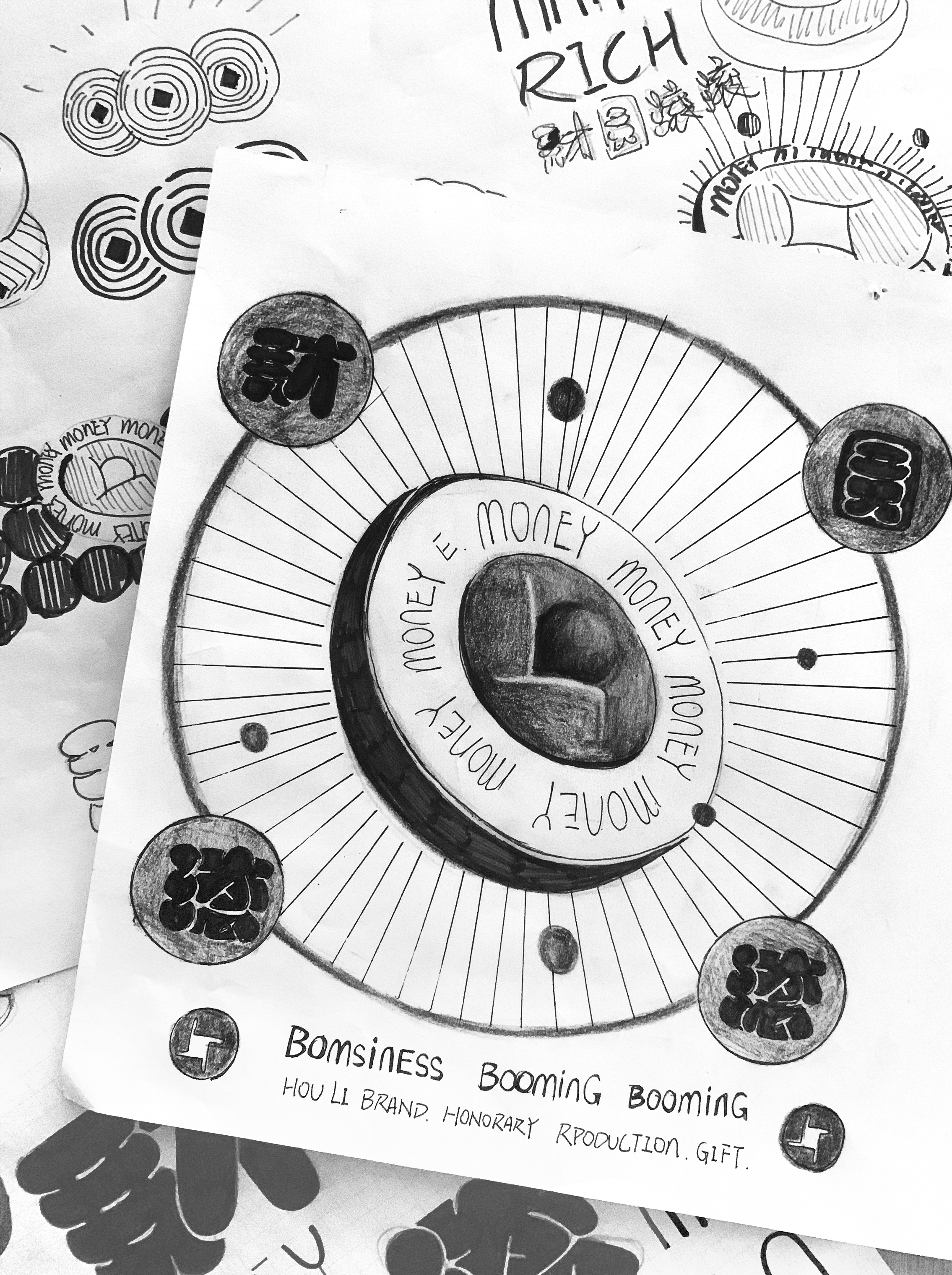 如何在画面上呈现财圆滚滚独树一帜的气质调性,在传统审美和文化意识中将创业、创意、创造、创富合而为一、和谐共存,设计师为此勾画了30余幅草图,终将复古风韵与时尚锋锐完美结合。
