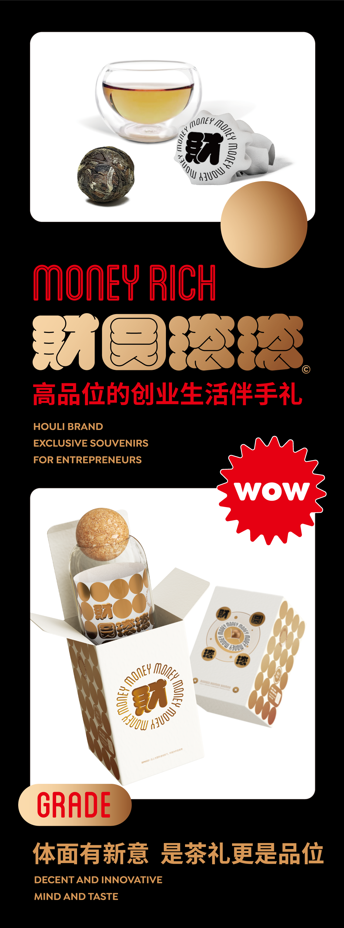 财圆滚滚从概念出发到最终成品落地,历时300余个日夜,经过概念命名、创意方向、稿件呈现、落地制作等多个环节,在不同的方向反复尝试,最终以茶为礼、财茶共融,为创业者呈现出这款颗颗饱满粒粒生财的高品位创业生活伴手礼。送给自己是对努力不歇、坚持探索的自我回报,敬奉他人则是对滚滚热情与虔诚敬意的诚切传递。