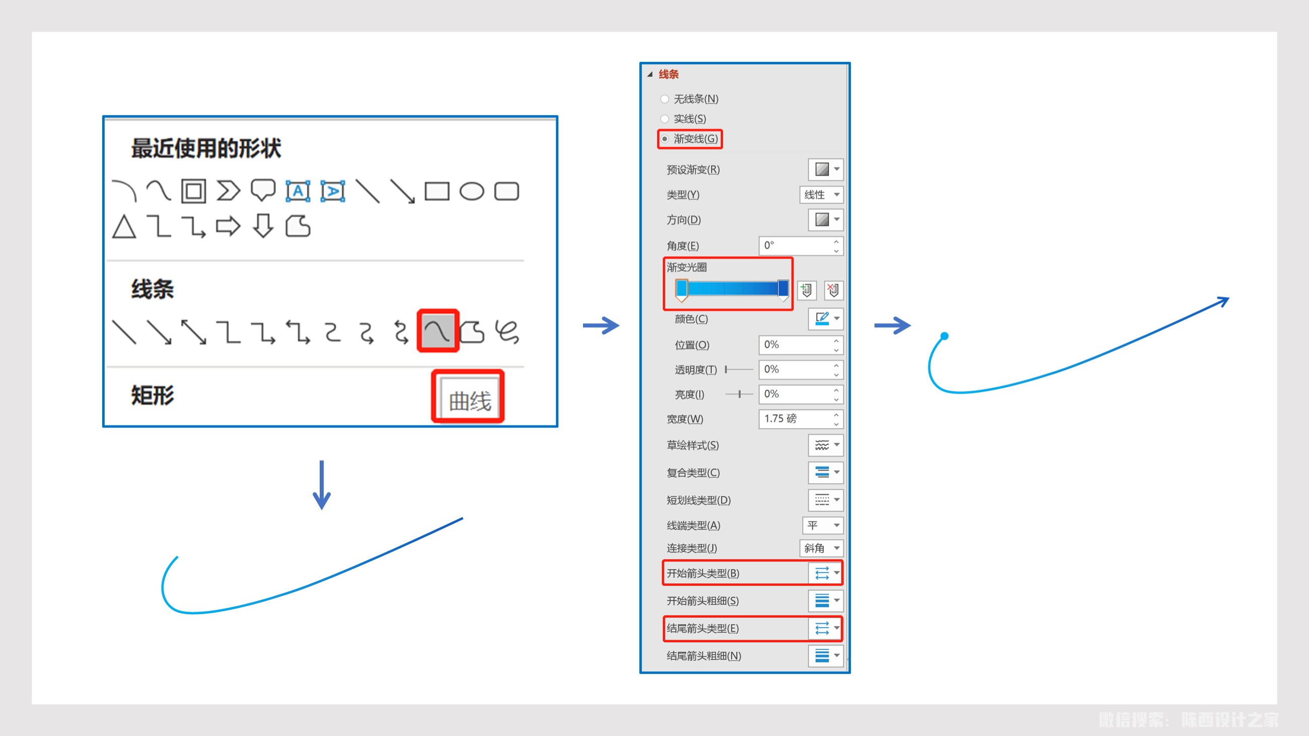 调节渐变,设置开始和结束箭头的类型就可以了。