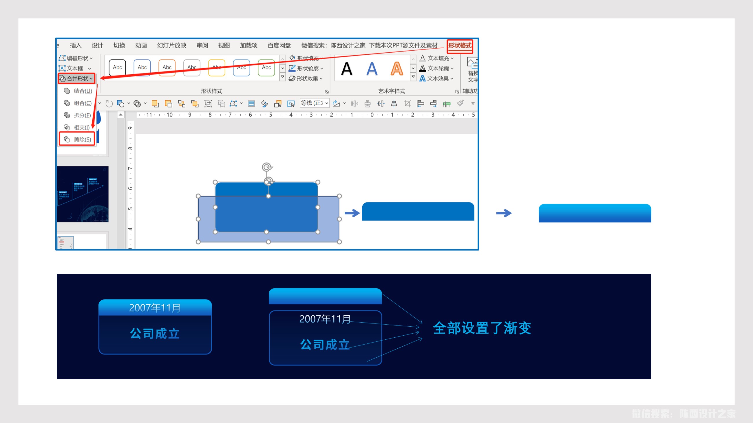 上端这个只有两个圆角的渐变矩形,是通过合并形状减除得到的。