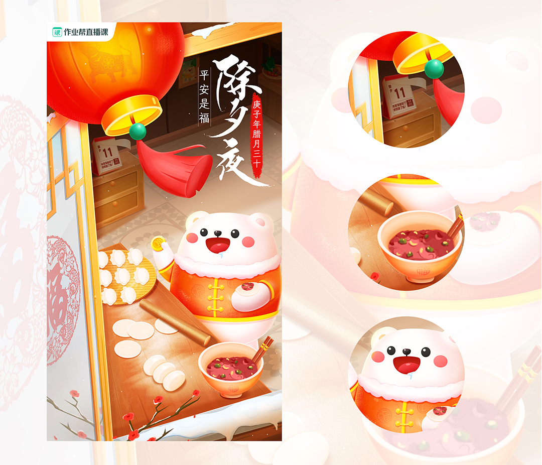 画面中雪球穿着喜庆又有年味新衣准备着年夜饭的饺子,窗外的灯笼被风吹起,雪花也落在了梅花枝头,反观屋子里温馨又带着期盼的感觉,雪球在饺子里包了一枚金币,结合了谁吃到带硬币的饺子预示着他在新一年中会取得财源广进的好运的习俗,也寓意对新一年的期许,在包饺子的同时雪球留着口水也增加了画面的趣味性。除夕夜的字体也做成了毛笔字的形式,更有中国传统节日的氛围。
