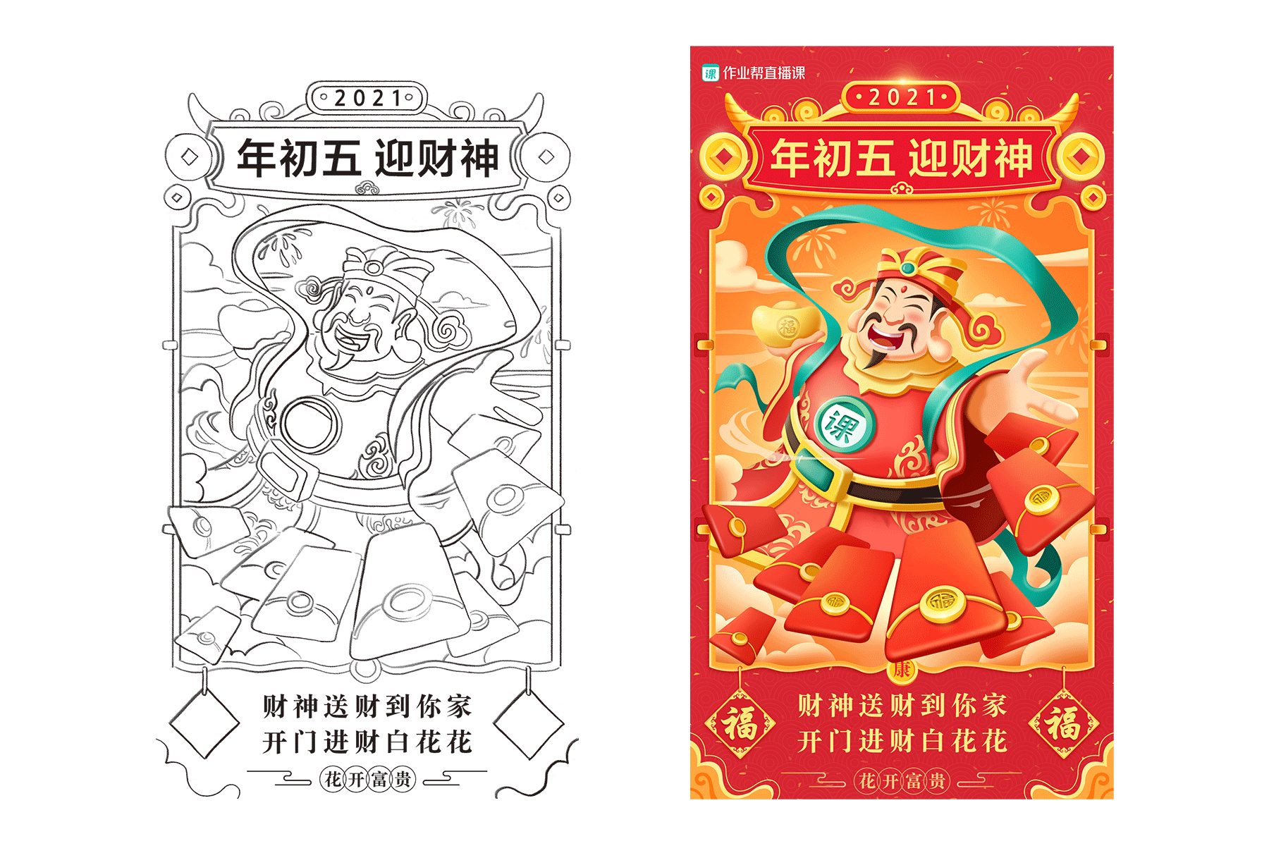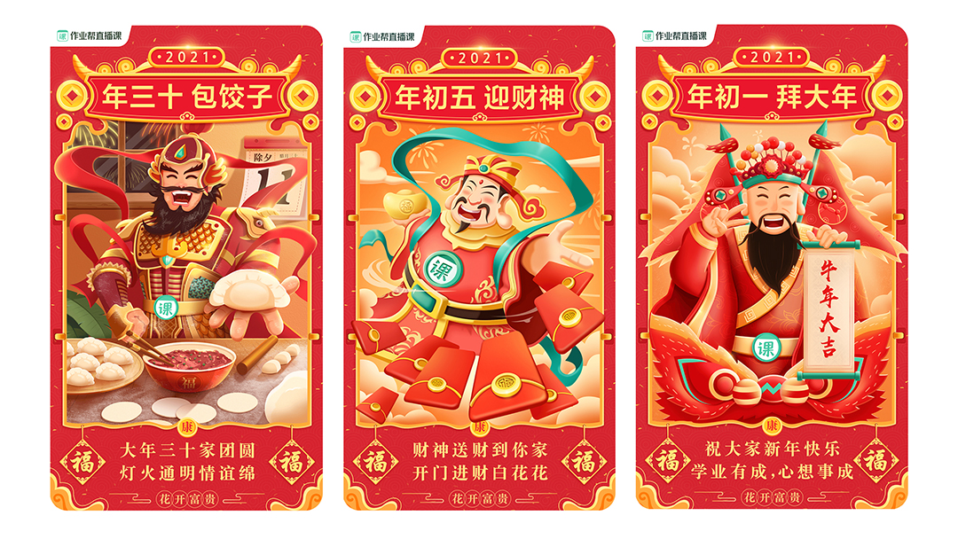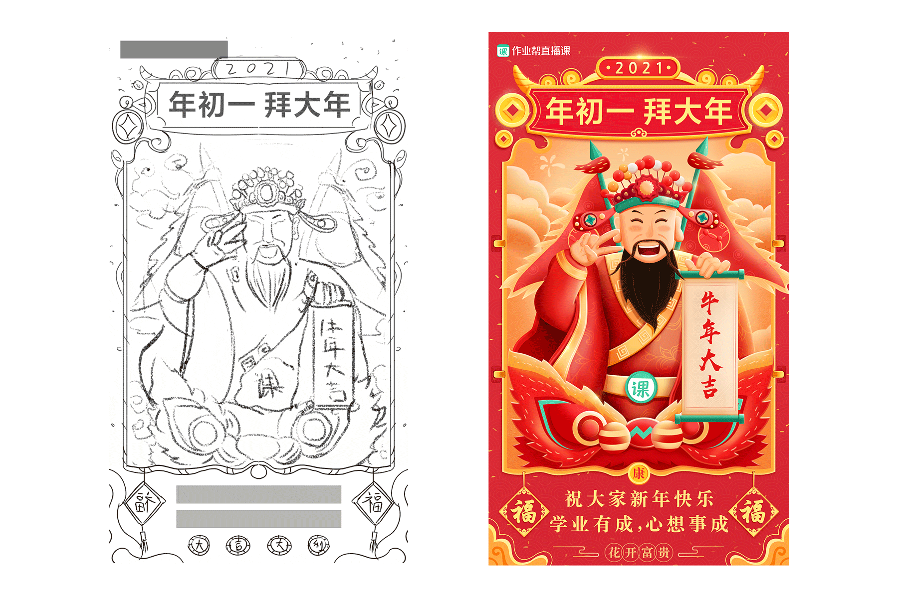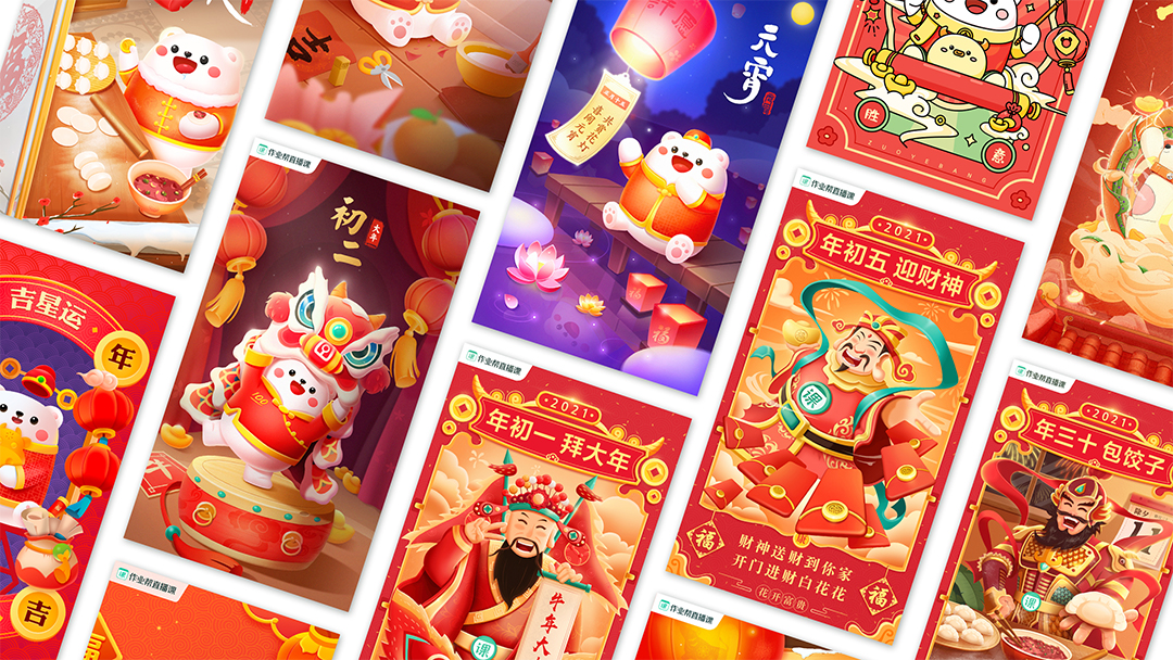 辅导运营设计组从属于作业帮直播课供给中心,主要业务是负责作业帮直播课小初高的留存运营业务。为更加精细的触达用户场景,增加品牌曝光率和影响力,提高用户黏性,为后期转化做推进,在2021农历牛年到来之际,同学们通过自己的创意在形式和内容上诠释年俗这一主题,与大家一起共度新年。
