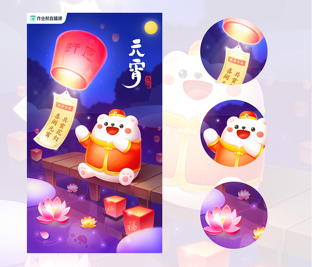 在正月十五这一天晚上,中国人素有赏花灯、吃汤圆、吃元宵、猜灯谜、放烟花等一系列传统民俗活动。本次元宵节海报以雪球放花灯的夜景图为主题进行设计,强调正月十五放花灯祈福的美好寓意,视觉元素选择了各式各样的传统花灯及祈福灯,主视觉为雪球放飞带着祈福字条的花灯,通过小桥、湖灯、字条等元素,配合整体环境,营造饱含祈愿祝福的节日气氛,也向大家传递了元宵节特有的美好祝福。