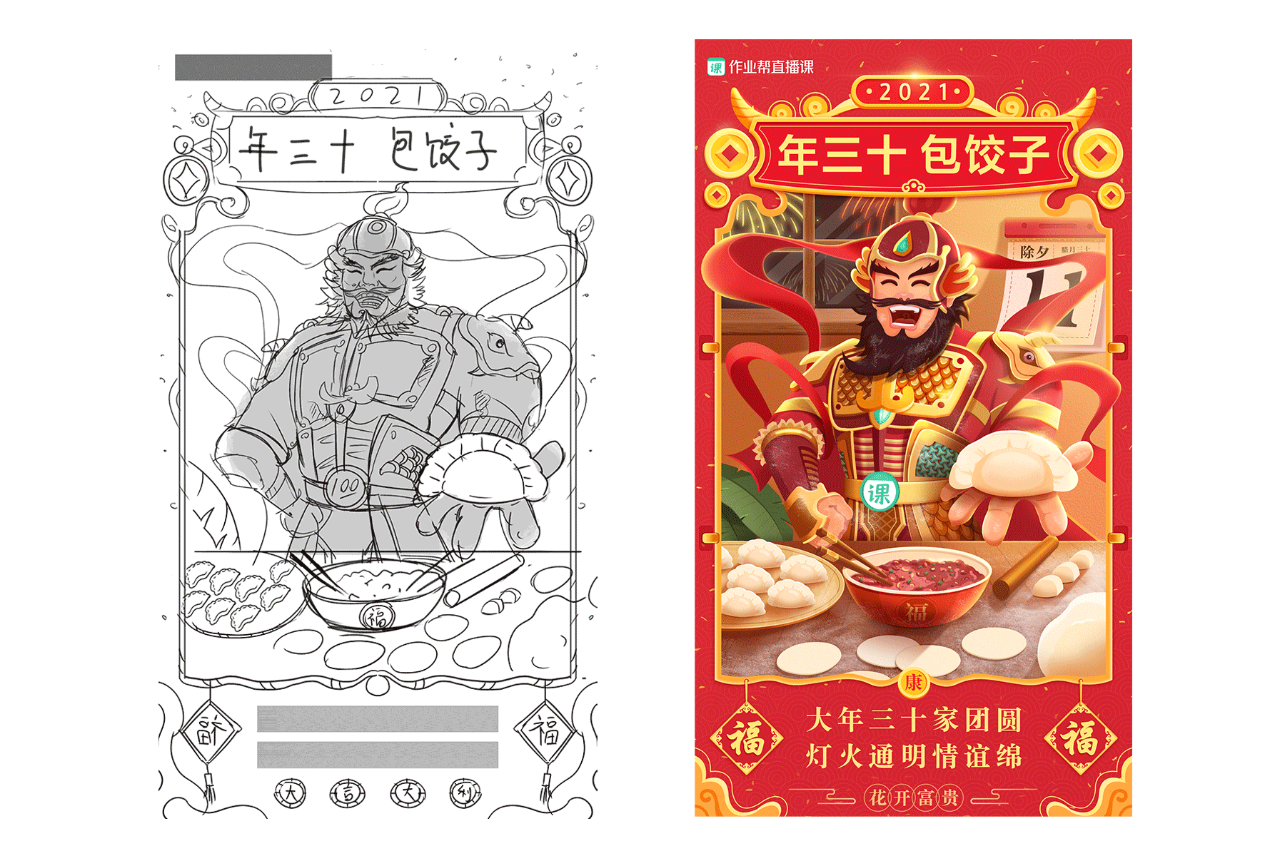 画面主要想营造一种温馨的氛围,结合年三十有贴门神的习俗,选取门神角色,加以场景塑造,外表粗旷威猛的门神也体现出细心温柔的一面,增加画面趣味性。